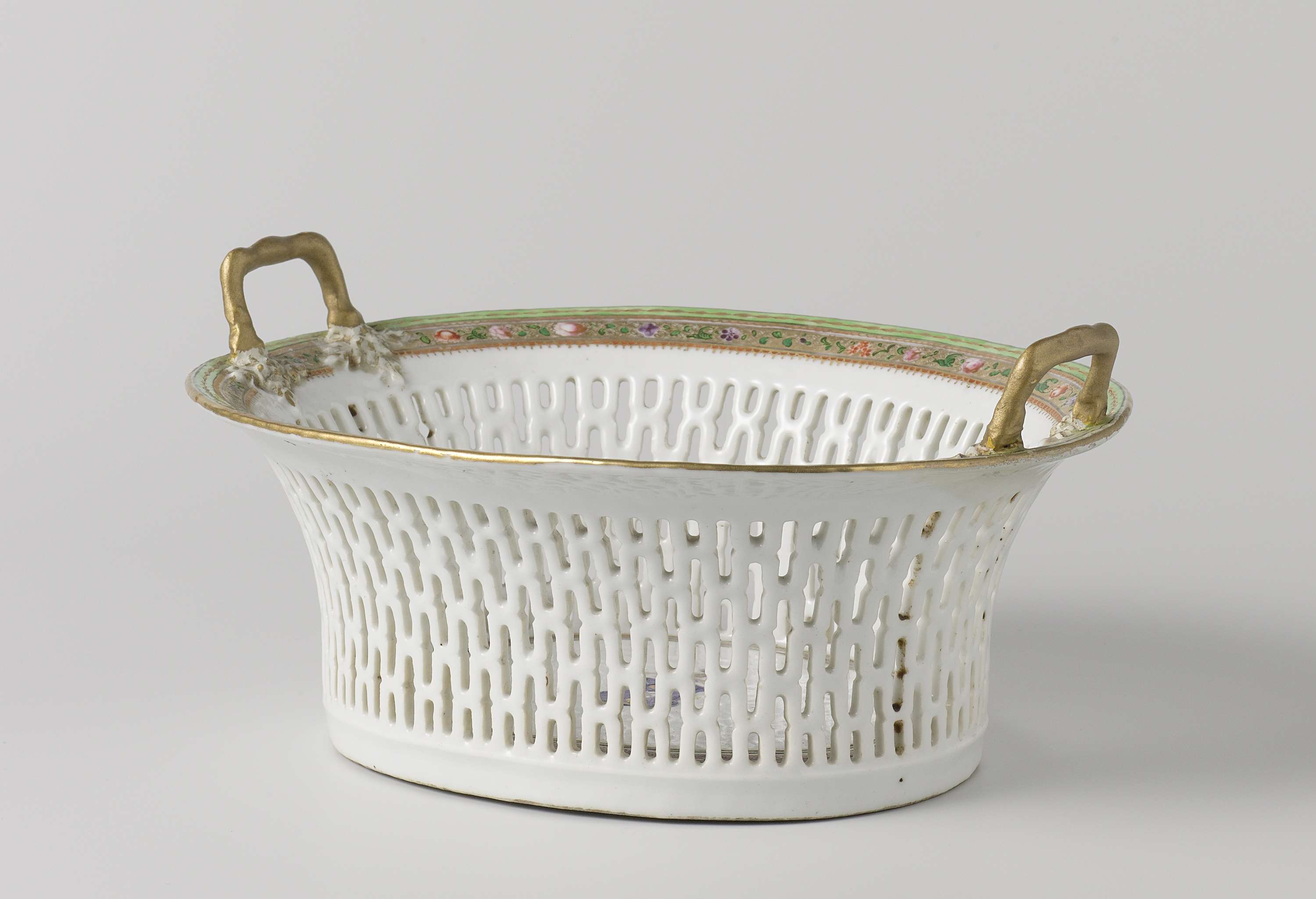 Fruitmand met ajour gewerkte wanden. Besdchilderd in emailkleuren en goud met het wapen van de familie Idsinga en smalle decoratieve banden. (Nederlands)