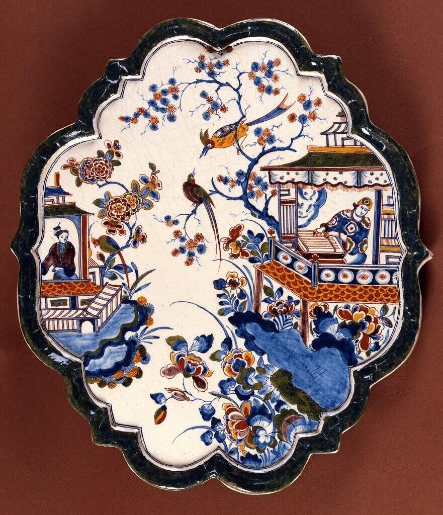 De ovaalvormige plaque met een symmetrisch geaccoleerde, groene rand is versierd met een chinoiserie voorstelling. Rechts is een paviljoen afgebeeld, op een door bloemen omgeven rots. In het paviljoen is een musicerende oosterse figuur te zien. Achter het gebouw is een bloeiende boom met twee vogels. Op de linkerhelft een kleiner paviljoen op een rots, waarin een luisterend figuur is afgebeeld. Achter dit gebouw is een bloeiende struik met een vogel afgebeeld. (Engels)