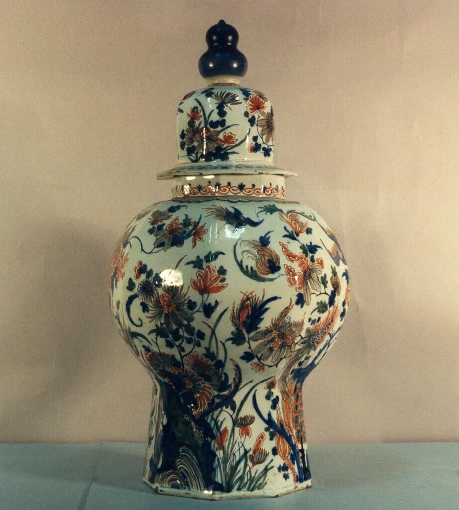 presentatietekst: De achtkantige balustervormige pot, met hoog koepelvormig, invallend deksel met overschietende kraag en houten kalebasvormige knop, verjongt zich naar onderen toe in een hoge voet en is gedecoreerd met een oosterse voorstelling met rotsen, vogels, en bloem- en bladwerk. De hoge deksel is beschilderd met een zelfde decoratie. Ondanks het feit dat deze pot op dit moment deel uitmaakt van een driedelig kaststel, werd dit formaat pot waarschijnlijk gedurende de zomermaanden in de haard gezet ter decoratie. Over het gebruik en de mogelijke functie geven ontwerptekeningen (ca. 1700) van de hofarchitect Daniel Marot duidelijkheid. In de beschrijving van 'chimney flower pots' in de verslagen van de East India Company uit 1704 kan eveneens bewijs worden gehaald dat dit soort potten een plaats kregen in de schoorsteen. In een publicatie van Jan Luyken (1649-1712) 'Het leerzaam huisraad' uit 1711 blijkt een grote balustervormige pot met deksel een 'doofpot' te zijn. Kennelijk werd deze naam ook gebruikt voor vergelijkbare, maar fraai gemodelleerde en beschilderde potten met deksels. Ook in verscheidene andere beschrijvingen uit de 17de en de 18de eeuw werden doofpotten genoemd. (Engels) | |||||||||||||||