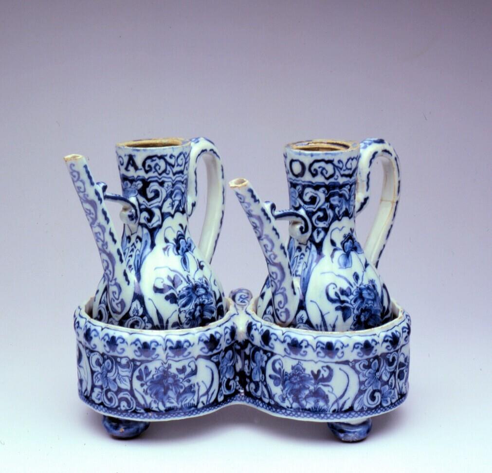 presentatietekst: Olie- en azijnstel met houder, gedecoreerd met chinoiserie motieven.Het olie- en azijnstel bestaat uit twee peervormige geribde kannetjes met een oorvormig handvat en licht gebogen tuit en een geribde houder op vier pootjes met een getordeerd oor. De centrale decoratie bestaat uit een peervormig cartouche gevuld met bloemen en een vogel. De cartouches zijn gescheiden door ranken en bloemmotieven. Op de handvatten zijn gestileerde ranken geschilderd. Eén flesje is voorzien van de letter 'O' en de ander van de letter 'A'. In de houder zijn ook deze letters terug te vinden. Dit duidt er wellicht op dat het stel voor Olie en Azijn werd gebruikt. Op de flessen geen stoppen of deksels. (Engels) | |||||||||||||||