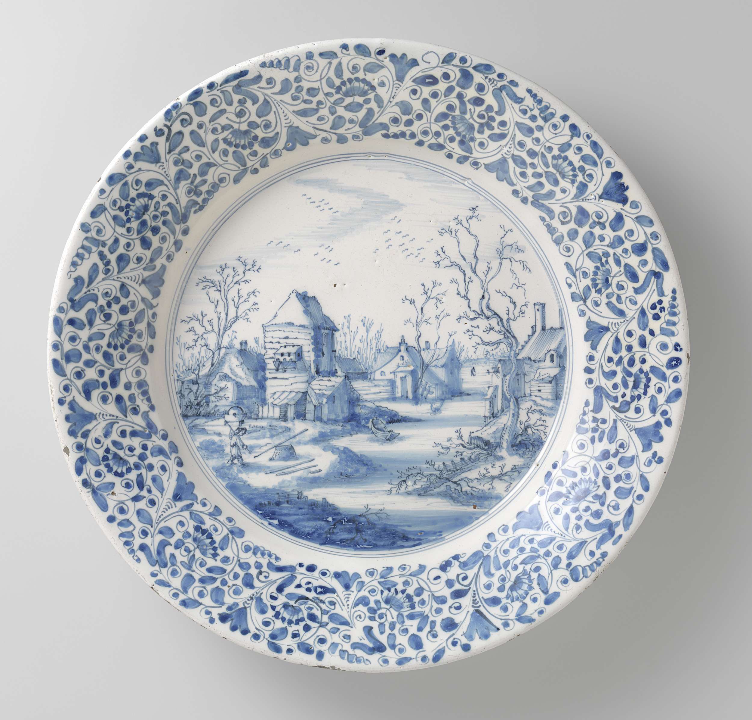 Schotel van faience, blauw beschilderd in het glazuur met een winterlandschap. Gedateerd op de achterzijde 1650. (Nederlands)