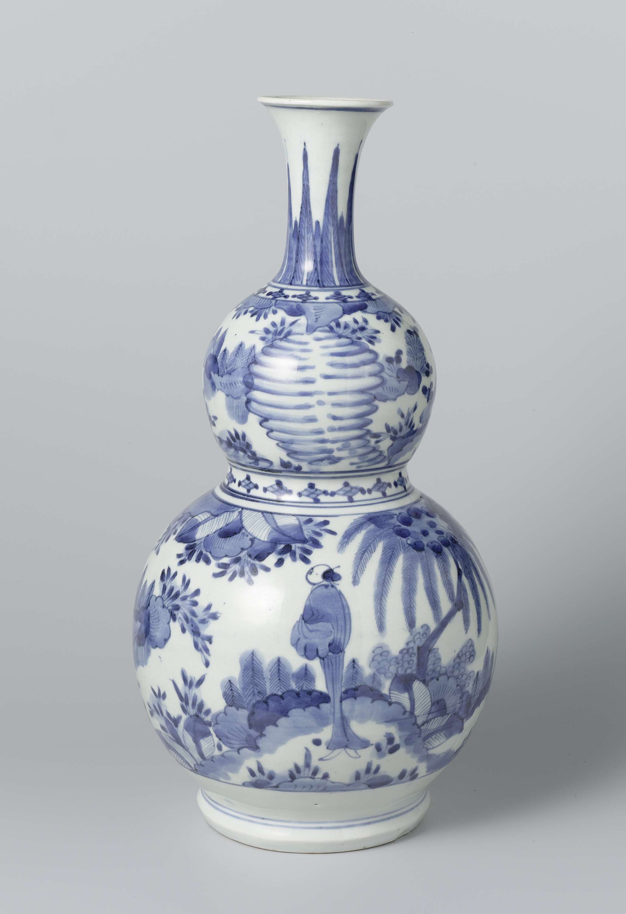 Kalebasvormige vaas van porselein met een spreidende hals, beschilderd in onderglazuur blauw. Op de buik tweemaal een doorlopend landschap met rotsen, bomen en planten. Het onderste deel van de buik met een staand en zitten persoon in het landschap, het bovenste deel met alleen een zittend persoon. Tussen beide delen en op de schouder een band met een ruitmotief. Op de hals een band met puntige bladmotieven. Twee barsten in de rand. Blauw-wit. (Nederlands)