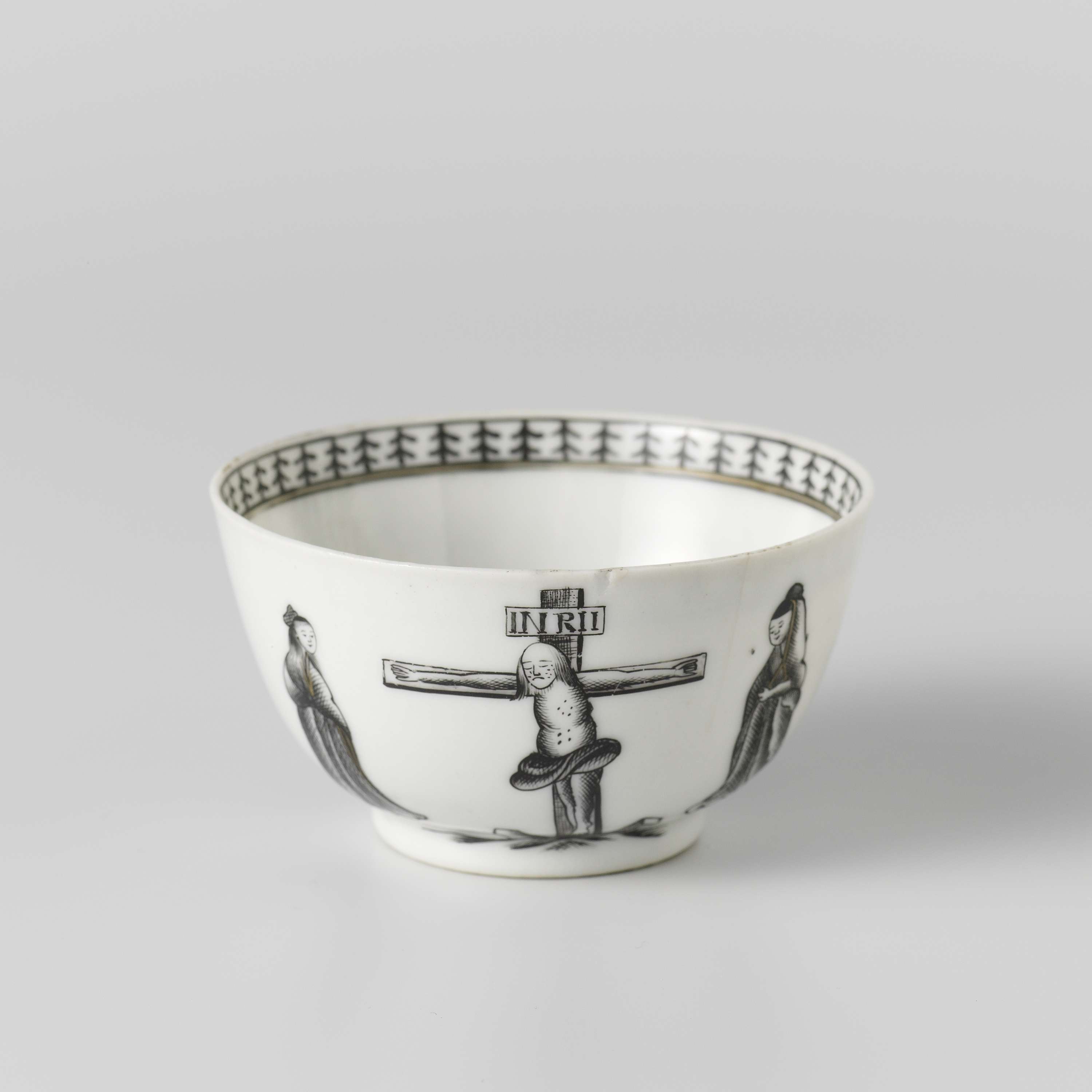 Klokvormige kop van porselein met een rechte wand, beschilderd op het glazuur in zwart en goud. Op de buitenzijde twee keer een voorstelling van de Kruisiging met de twee Maria's; de bodem met een twijg; op de binnenrand een band met een decoratief patroon. Een chip in de rand en een barst in de wand. Onderdeel van een theeservies. Europese voorstelling in encre de Chine. (Nederlands)