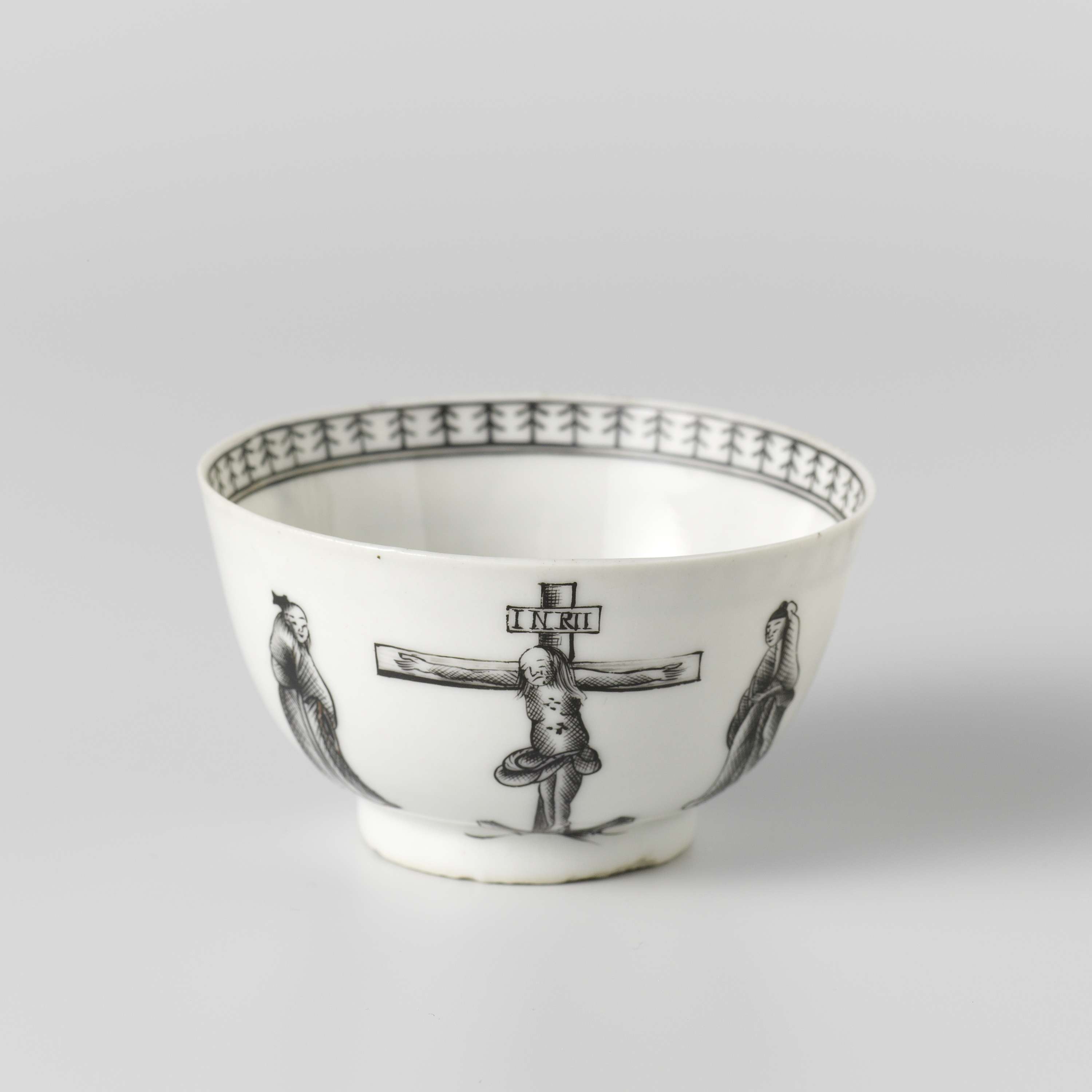 Klokvormige kop van porselein met een rechte wand, beschilderd op het glazuur in zwart en goud. Op de buitenzijde twee keer een voorstelling van de Kruisiging met de twee Maria's; de bodem met een twijg; op de binnenrand een band met een decoratief patroon. Een barst in de wand. Onderdeel van een theeservies. Europese voorstelling in encre de Chine. (Nederlands)