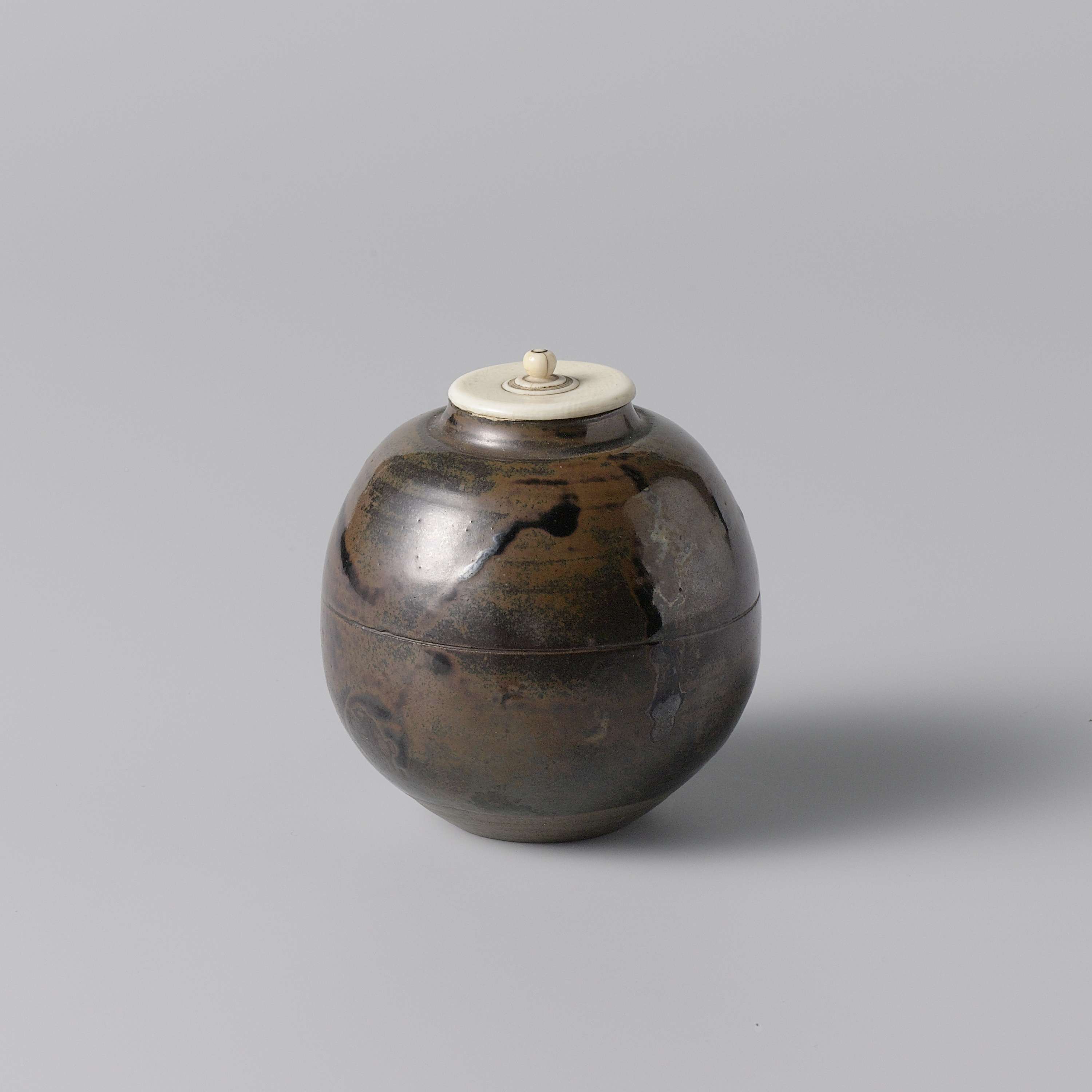 Stoftheebus of chaire van steengoed met een ivoren deksel, gedeeltelijk bedekt met een goudbruin glazuur. Het onderste deel van de bus is ongeglazuurd. Nasu-type. Oud label op de onderzijde met 'W569'. Seto. (Nederlands)