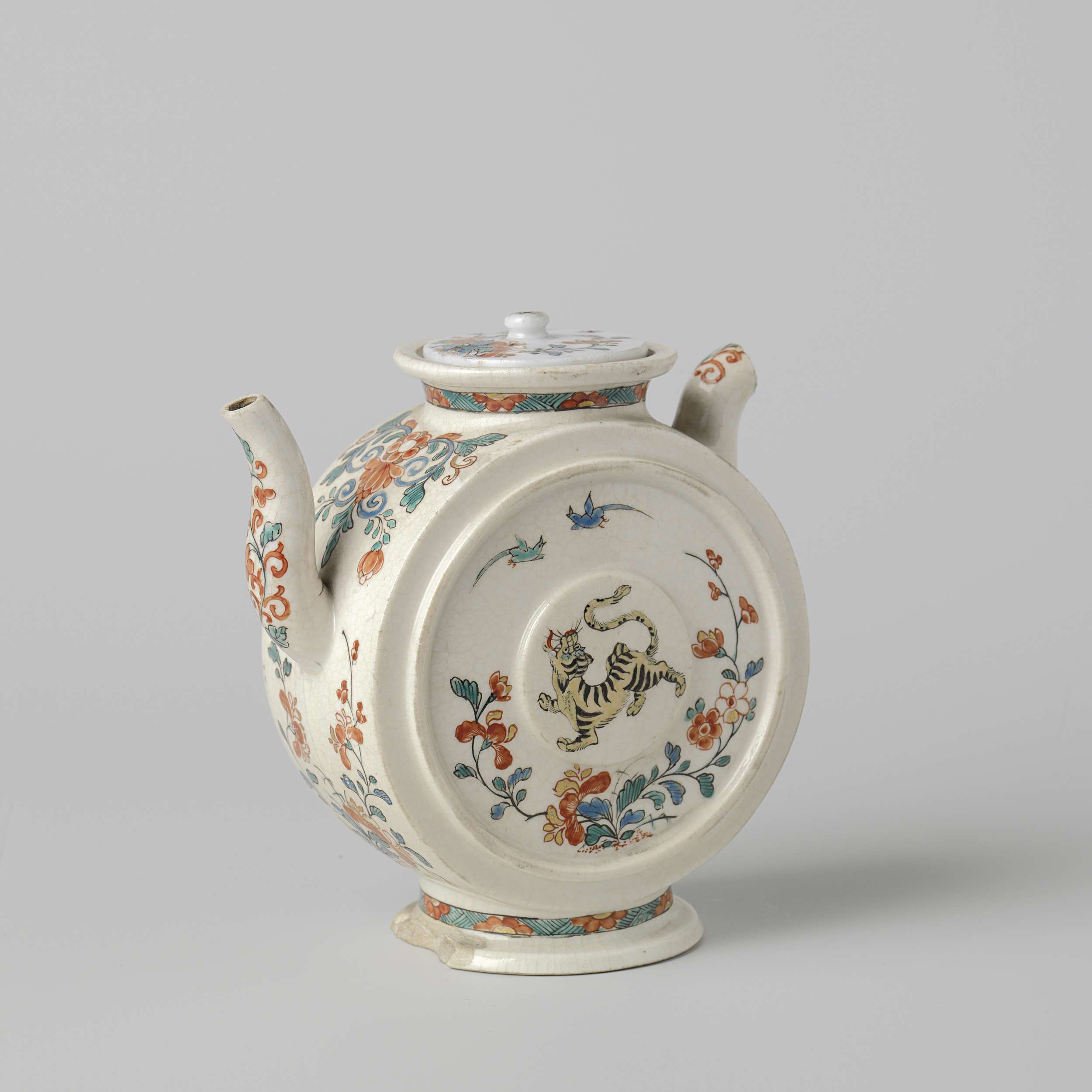 Trekpot, rond en plat, gecraqueleerd glazuur, versierd met tijger en bladranken in kleuren. Oor ontbreekt, deel tuit eveneens. (Nederlands)