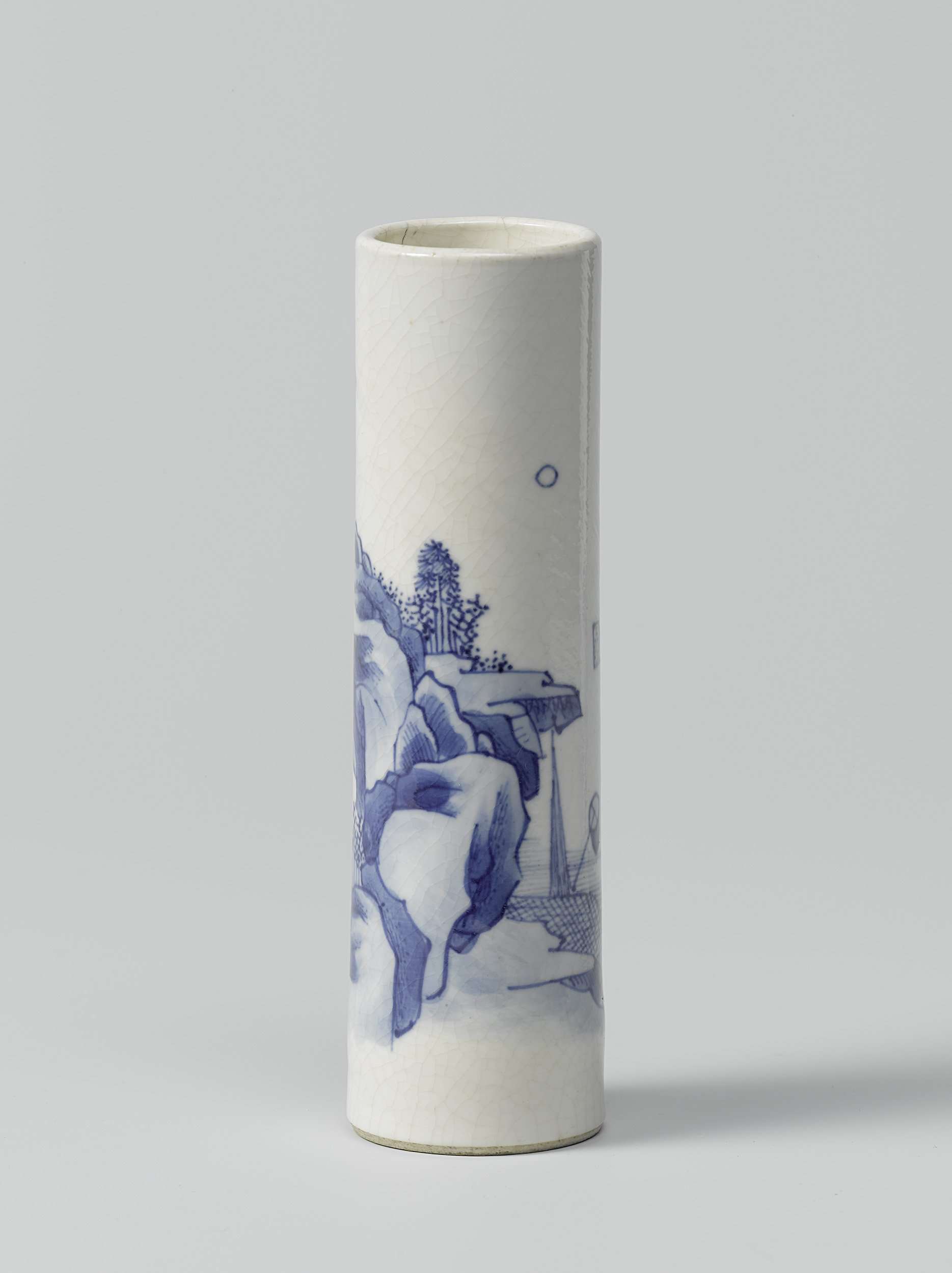 Slanke cilindrische penselen pot beschilderd in onderglazuur blauw met een vissersboor in een rotsig waterlandschap. De vertaling van de inscriptie luidt: 'water in duizend rivieren, in duizend rivieren schijnt de maan; tienduizend mijlen zonder wolken, tienduizend mijlen hemel'. (Nederlands)