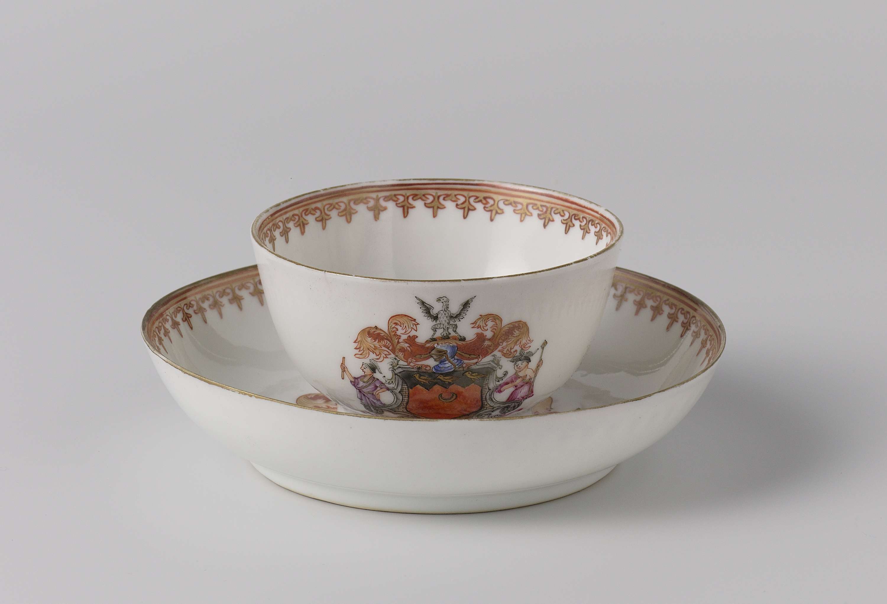 Kop en schotel, beschilderd in emails en goud met het wapen van de familie Lovelace en een spearhead-rand. (Nederlands)