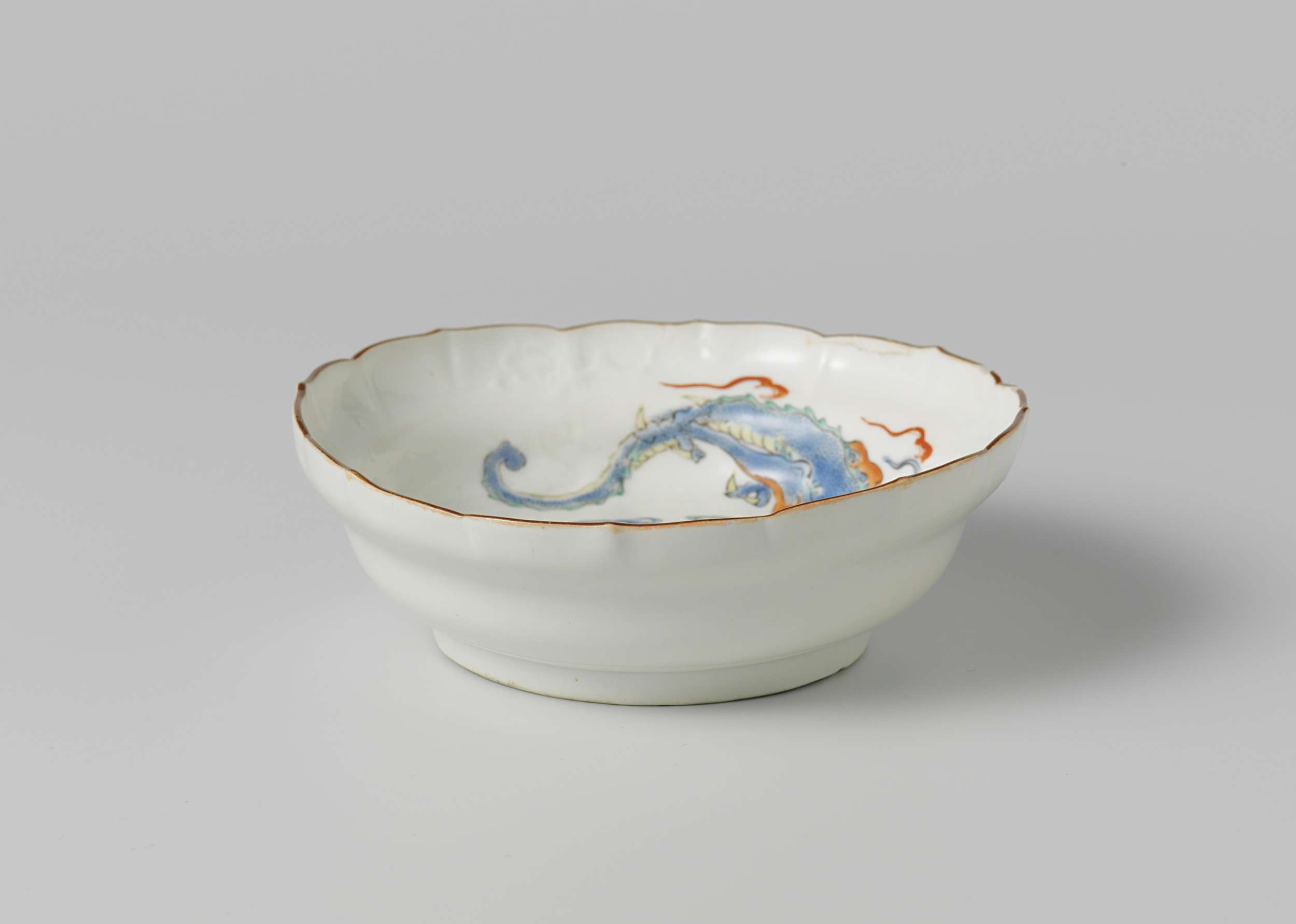Ondiepe kom met een opstaande accoladevormige raand (bruin gegelazuurd). Gedecoreerd in emails op het glazuur met een draak die op een parel jaagt. In de wand (nauwelijks te herkennen) bloeiende planten en bomen in reliëf. (drie kleine chips aan de rand). Kakiemon porselein. (Nederlands)