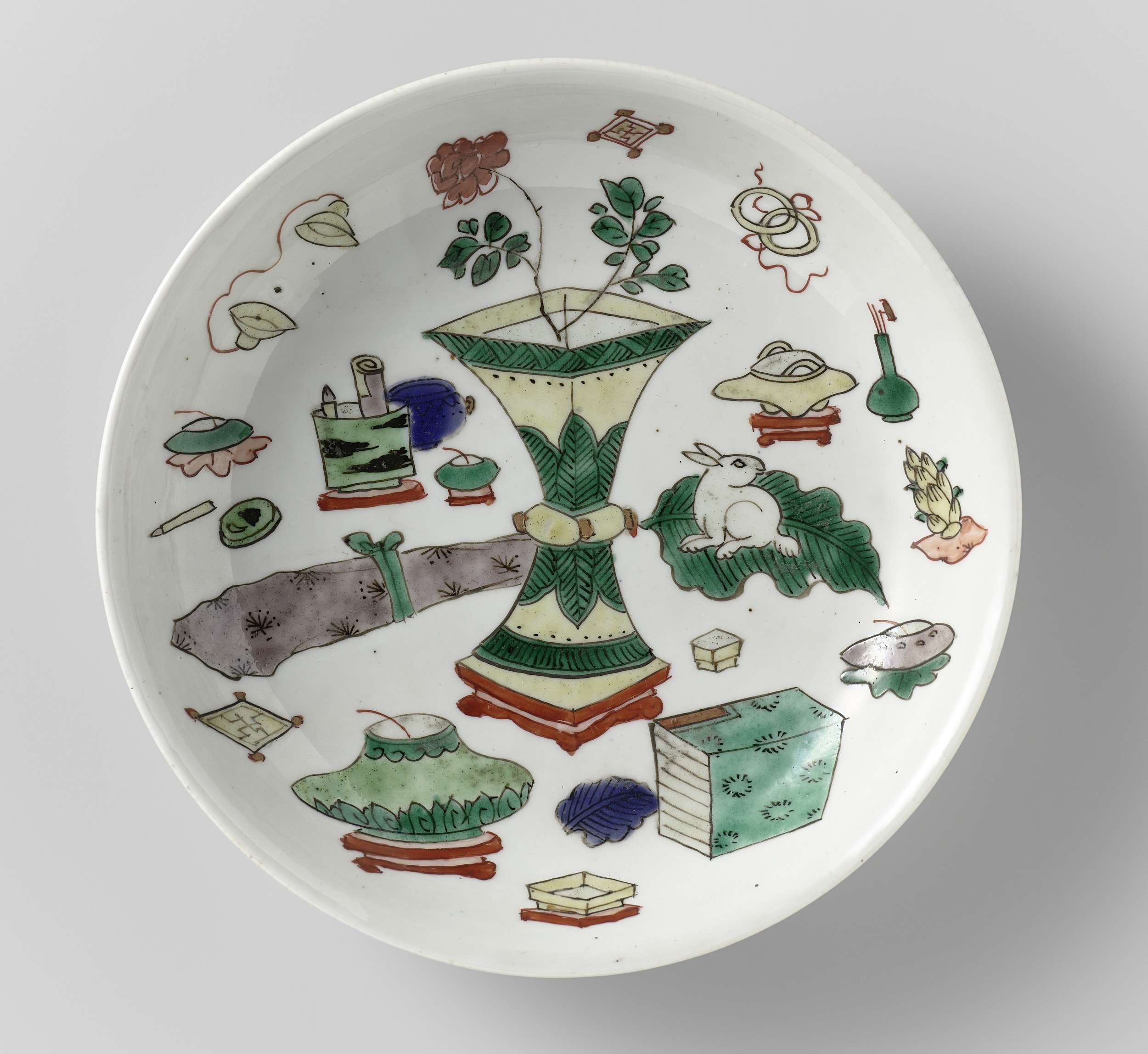Schotel met ronde wand van porselein, beschilderd in onderglazuur blauw en op het glazuur blauw, rood, groen, geel, aubergine, zwart en goud. Op het plat Chinese antiquiteiten; de onderzijde met vier kostbaarheden. Gemerkt op de onderzijde met een zegelmerk in een dubbele cirkel. Drie barsten in de rand. Famille verte. (Nederlands)