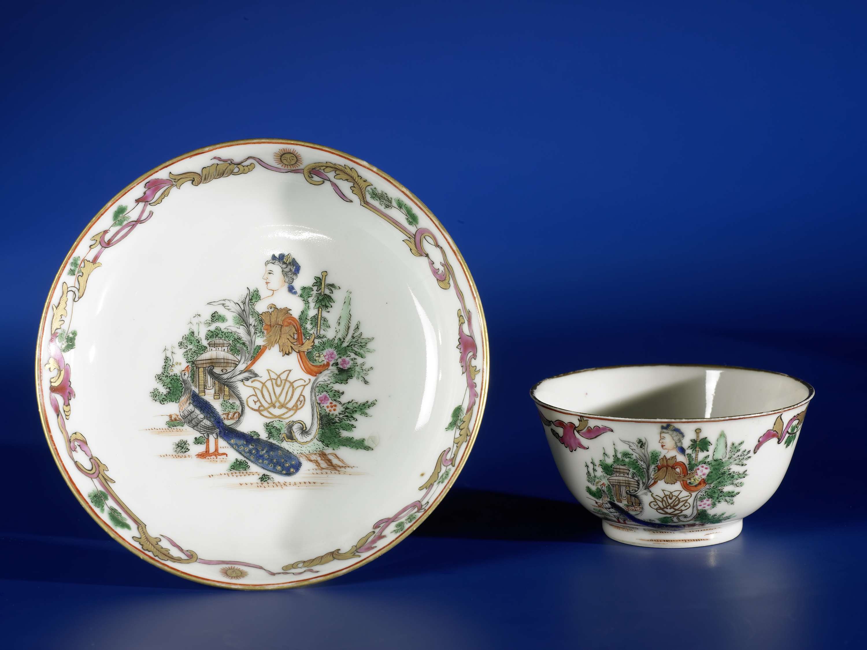 Klokvormige kop en schotel van porselein, beschilderd op het glazuur in blauw, rood, roze, groen, zwart en goud. Op het plat een rijkversierd cartouche met hierin het monogram 'IDF'; om het cartouche een landschapje met een pauw, een Grieks uitziende, ronde tempel en een buste van een Grieks uitziende vrouw; op de rand een band met bladranken met tweemaal een stralende zon met een gezicht. Europese voorstelling in emailkleuren. (Nederlands)