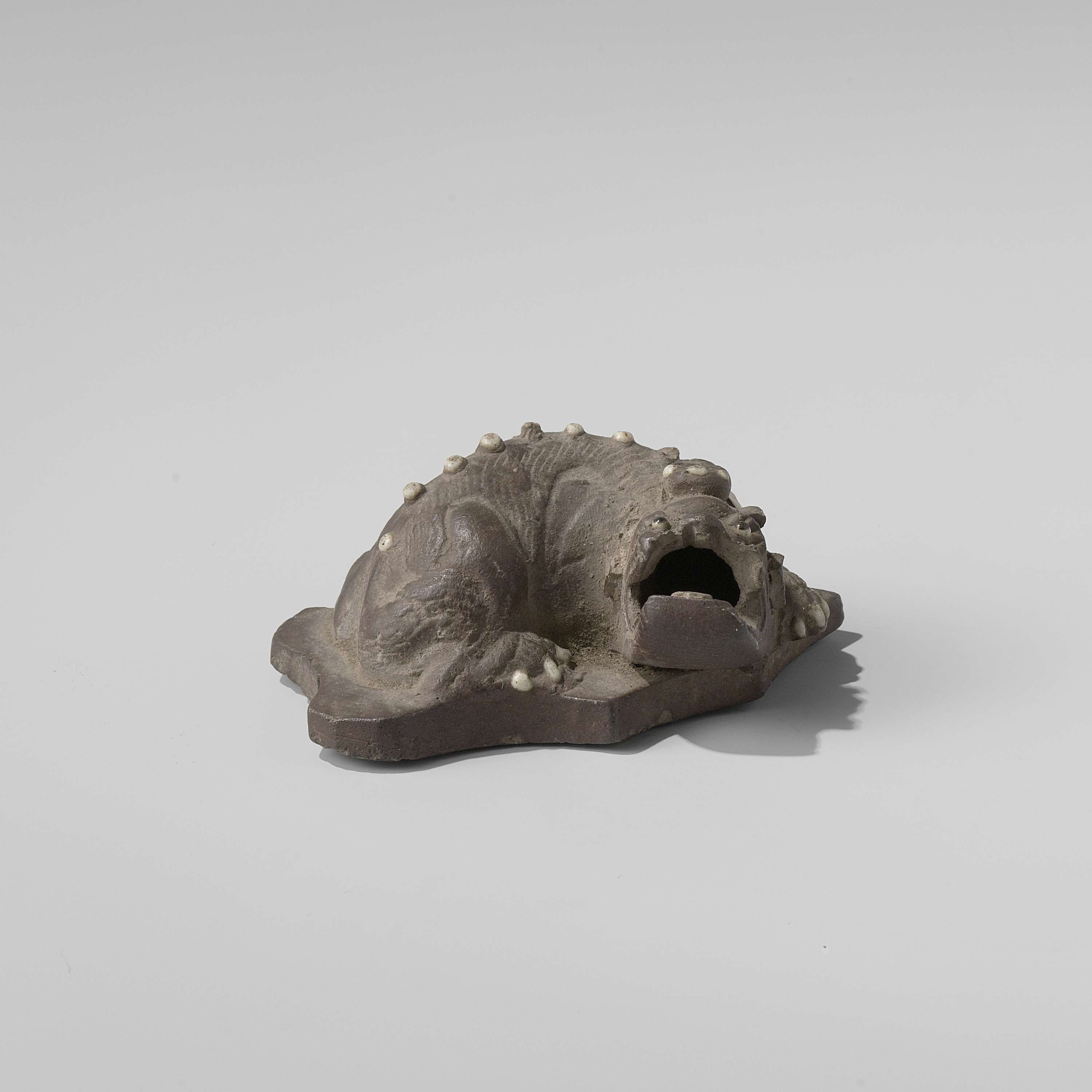 Beeld van donker steengoed, ongeglazuurd. Het beeld is in de vorm van een liggende shishi (leeuwhond) met een open bek op een blad; enkele kenmerken, zoals ogen en nagels, zijn ingelegd met een wit materiaal. (Nederlands)