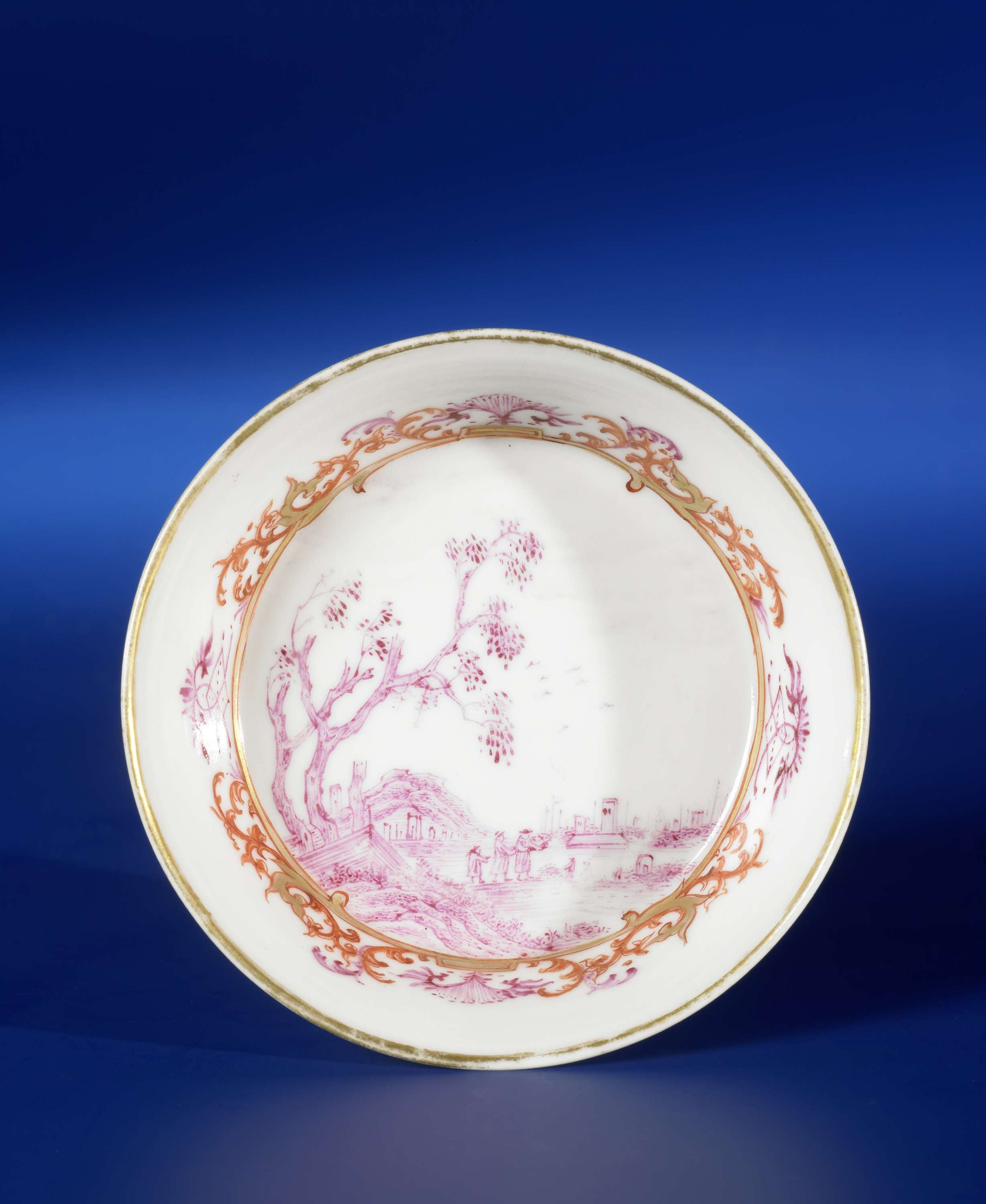 Bord op een voetring, gedecoreerd in roze (en camaïeu), ijzerrood en goud. Centraal een voorstelling van een waterlandschap, op de achtergrond vele schepen. Op de voorgrond een sloep, een boom en enkele Europeanen. Rond de voorstelling een decoratief patroon. Op de rand een gouden band. (Nederlands)