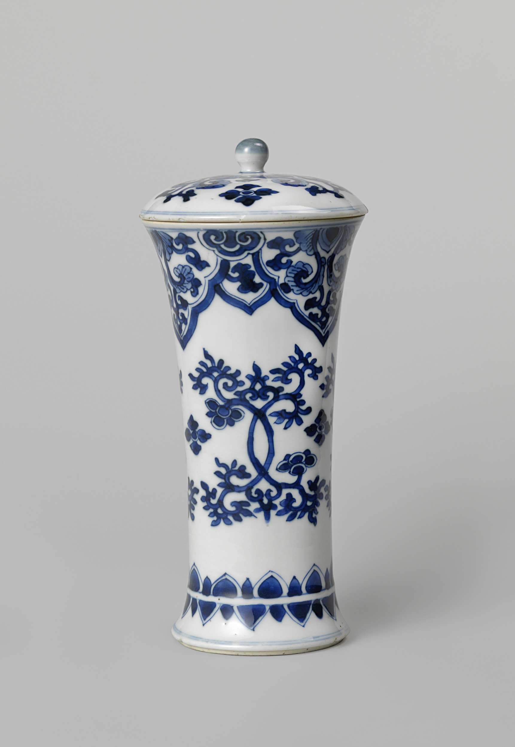 Cilindrische beker van porselein, het lichaam naar boven iets uitlopend, beschilderd in onderglazuur blauw. Op de wand een band met gestileerde bloemranken; om de rand een band met afhangende bladvormige cartouches gevuld met bloemranken afgewisseld met ruyi-motief; rond de voet een band met halve bladmotieven. De deksel met bladranken. Blauw-wit. (Nederlands)