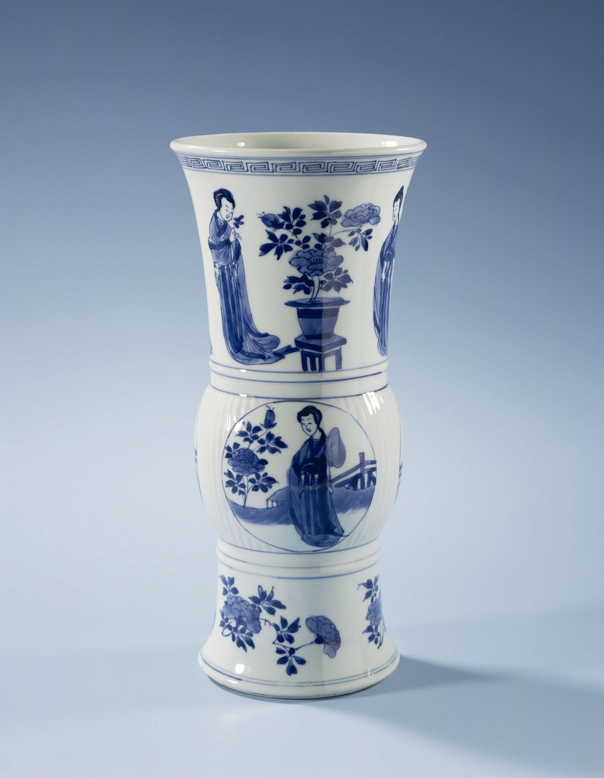 Bekervaas van porselein met een geribde ringvormige verdikking, beschilderd in onderglazuur blauw. Op de verdikking drie medaillons met een vrouwen (lange lijzen) bij een bloeiende pioen in een omheinde tuin. Hieronder een band met pioentakken. Boven de verdikking tweemaal twee vrouwen met een blad in de hand, gescheiden door een bloempot. Op de rand een meander-patroon. Gemerkt op de onderzijde met het vier-karaktermerk van keizer Chenghua. Blauw-wit. (Nederlands)