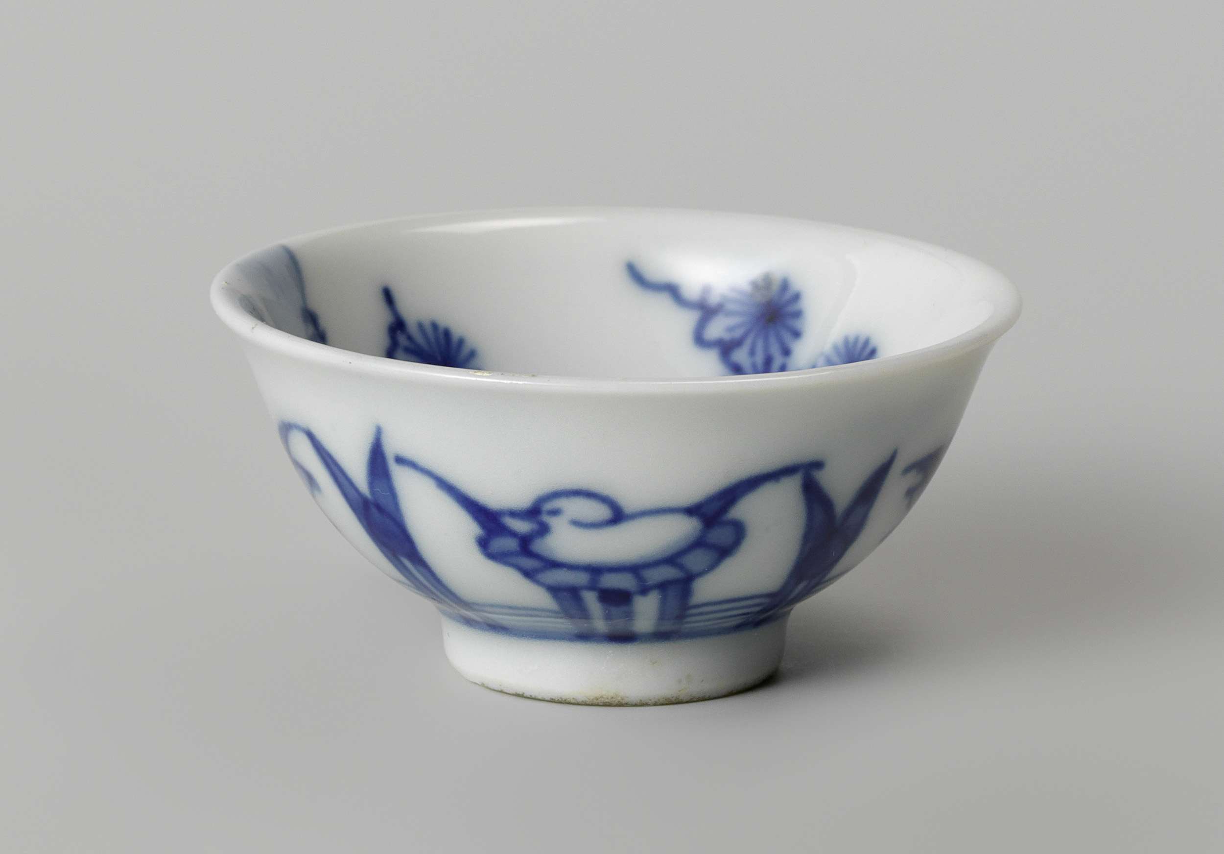 Klokvormige kop van porselein, beschilderd in onderglazuur blauw. Op de buitenwand een doorlopende band met gestileerde lotusplanten met afwisselend een bloem en een vogel op een blad. De binnenzijde met een doorlopend landschap met paviljoens, personen en een pijnboom bij een rots. Gemerkt op de onderzijde met twee ongeïdentificeerde Chinese karakters in een cirkel. Blauw-wit. (Nederlands)
