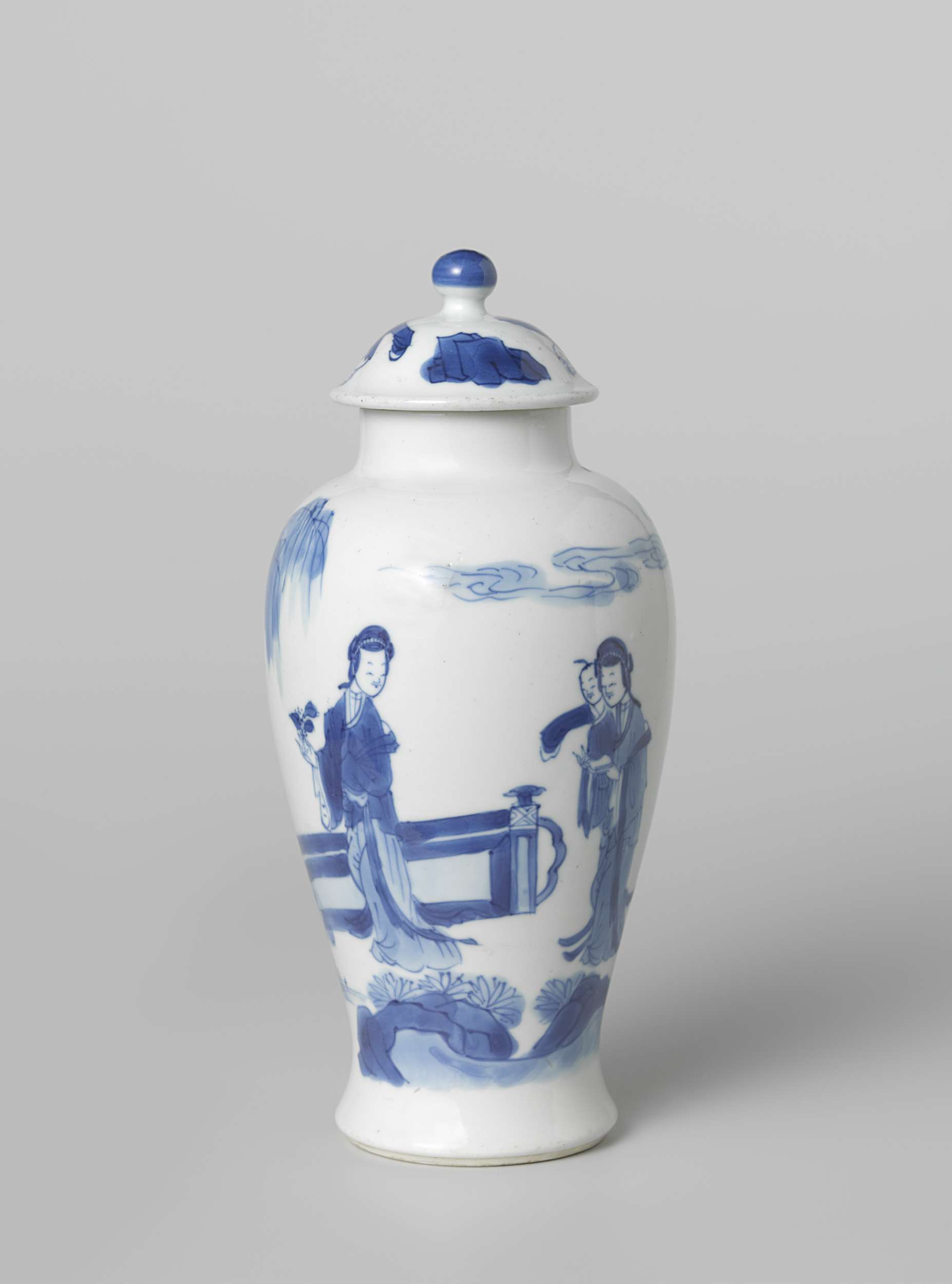 Dekselpot van porselein, beschilderd in onderglazuur blauw. Op de wand twee vrouwen (lange lijzen) en twee jongens (zotjes), waarvan één dansend, in een omheinde tuin met een bananenplant en een wilg. De deksel met twee dansende jongens gescheiden door rotsen. Blauw-wit. (Nederlands)