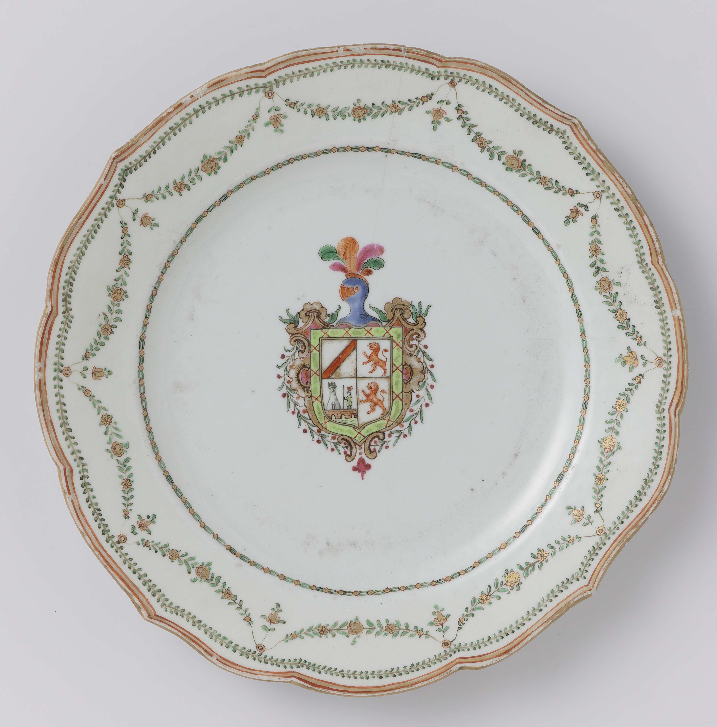 Bord van porselein met geschulpte rand, beschilderd op het glazuur in blauw, rood, roze, groen, zwart en goud. Op het plat een familiewapen omgeven door krulwerk en bloemranken met aan de bovenzijde een geveerde helm. Het wapen is verdeeld in vier vakken: twee met een leeuw, één met een diagonale, rode streep en één met een soldaat naast een toren; op de wand een decoratieve band; de rand een doorlopende bladrank met daaraan guirlandes. Een barst in de wand; enkele chips in de rand. Wapenporselein met emailkleuren. (Nederlands)