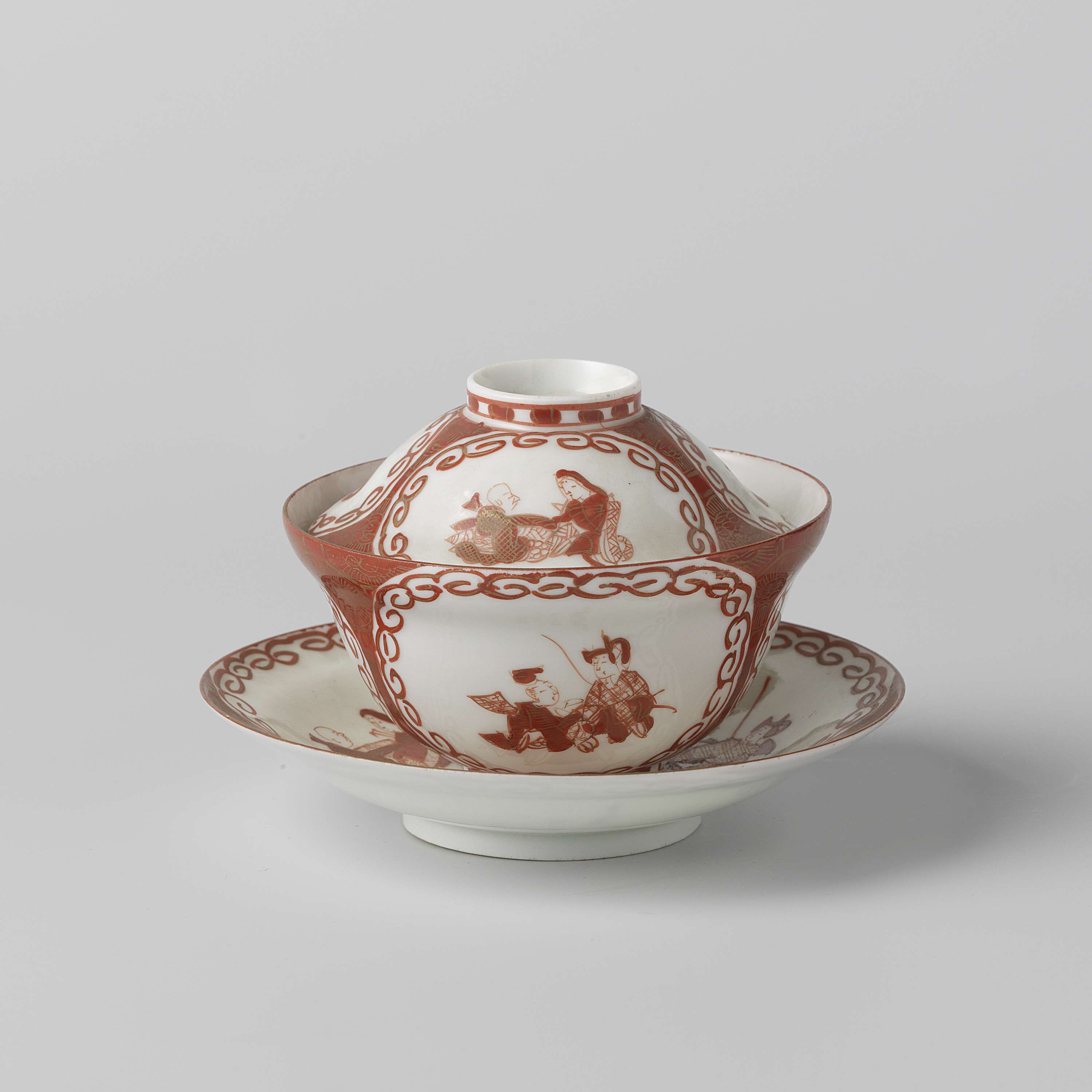 Klokvormige dekselkop en schotel van porselein met een ringvormige knop, beschilderd op het glazuur in rood en goud. Op de voorzijde van de schotel drie cartouches met telkens twee zittende mensen omgeven door een band krulwerk; tussen de cartouches een geometrisch patroon. Gemerkt op de onderzijde met drie ongeïdentificeerde karakters. (Nederlands)