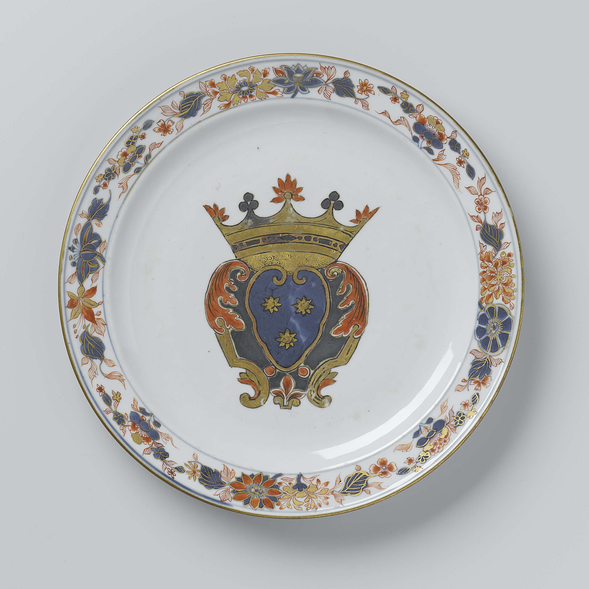 Bord op voetring in Chinees Imari-stijl. In het plat het wapen van de familie Piso of De Vroede. Het wapen heeft een blauwe achtergrond met drie gouden sterren of bloemen en is omgeven door een cartouche in Louis XIV-stijl; boven het wapen een kroon. Op de rand een band van bloemen in blauw, rood en goud. (Nederlands)