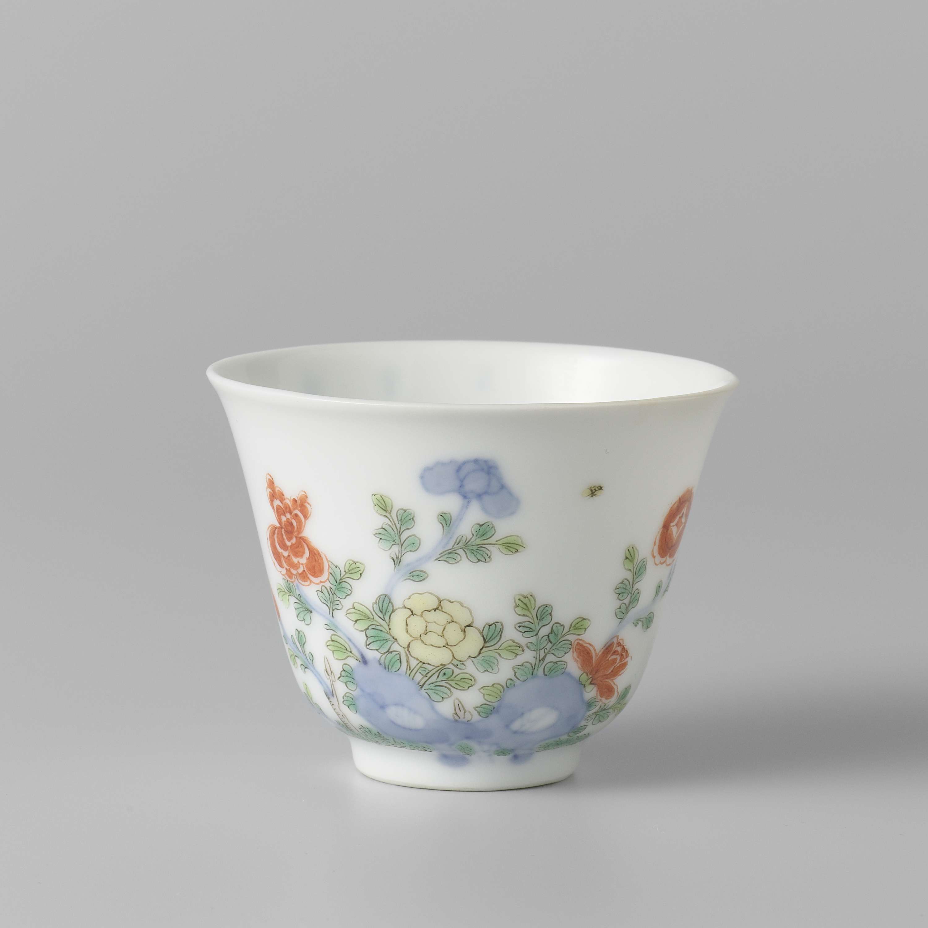 Klokvormige kop van porselein, beschilderd in onderglazuur blauw en op het glazuur blauw, rood, groen, geel, aubergine en zwart. Maandkopje van de vierde maand met op de buitenwand een pioenplant en een tweeregelig gedicht afgesloten door het zegelmerk 'shang', waardering. Gemerkt op de onderzijde met het zes-karaktermerk van keizer Kangxi in een dubbele cirkel. Porselein met emailkleuren. (Nederlands)