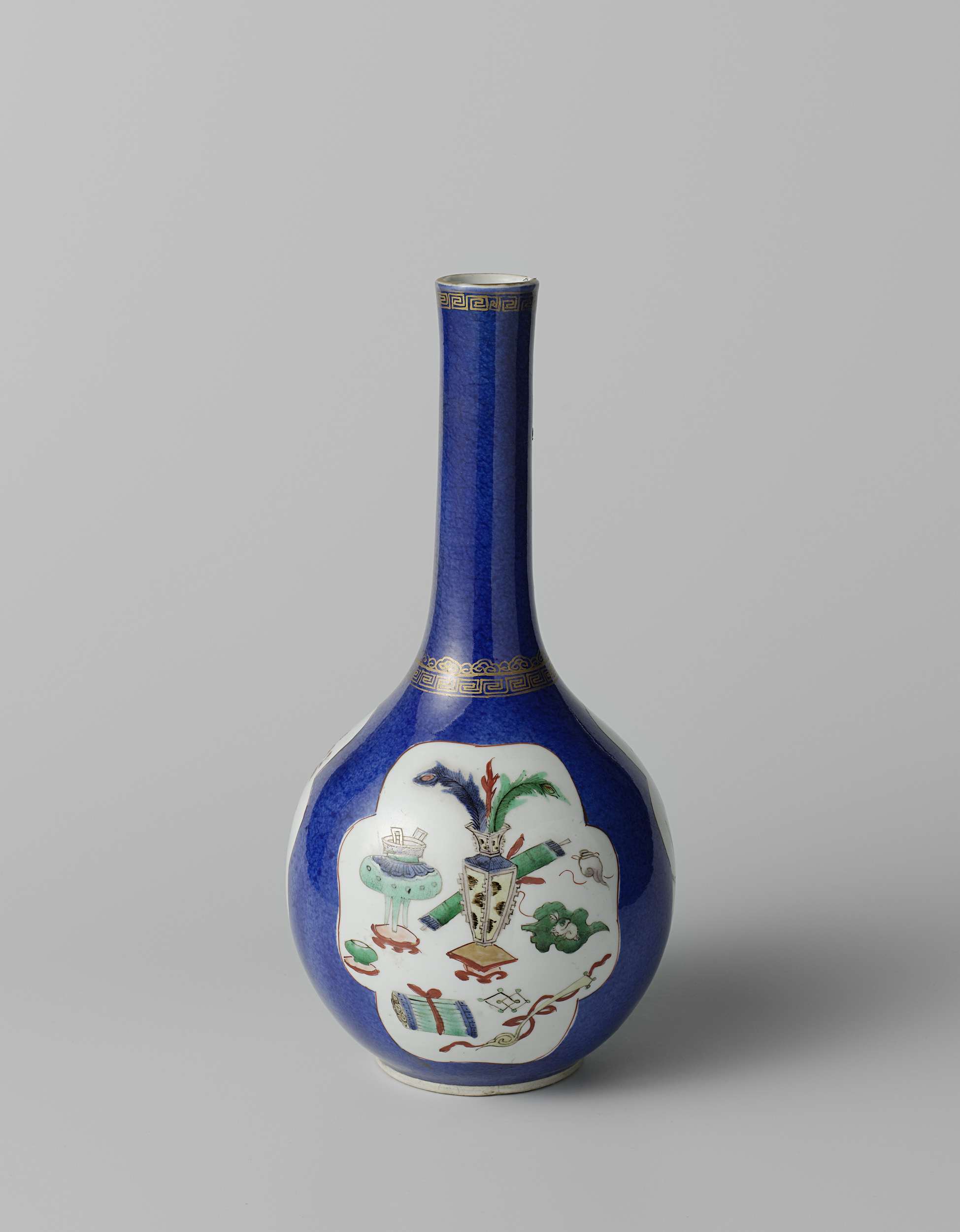 Flesvormige vaas van porselein met peervormige buik en lange, rechte hals, beschilderd in onderglazuur blauw en op het glazuur blauw, rood, groen, geel, aubergine, zwart en goud. De fles is bedekt met bleu poudré met op de wand drie uitgespaarde gelobde velden, waarvan één gevuld met antiquiteiten en twee met bloemtakken; om de basis van de hals een decoratieve band met meander- en ruyi-motief; om de rand een band met meandermotief; de rand bedekt met goud. Bleu poudré met famille verte. (Nederlands)