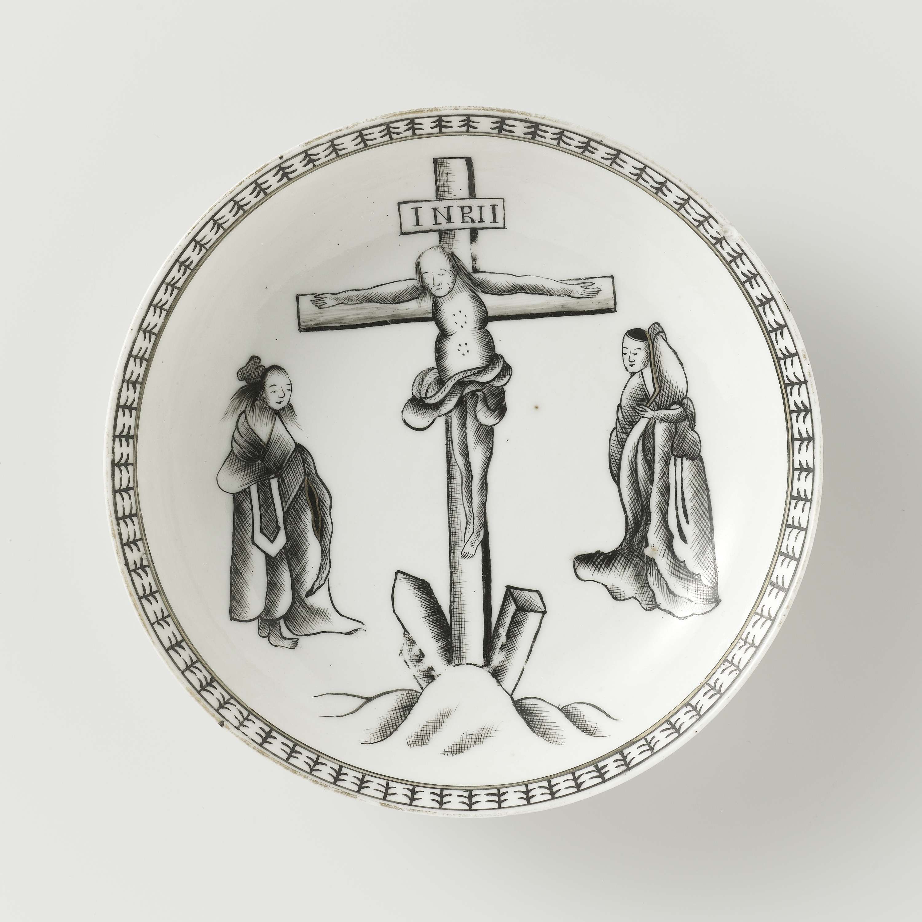 Schotel van porselein, beschilderd op het glazuur in zwart en goud. Op het plat van de schotel een voorstelling van de Kruisiging met de twee Maria's; op de rand een band met een decoratief patroon. Twee barsten en een chip in de rand. Onderdeel van een theeservies. Europese voorstelling in encre de Chine. (Nederlands)