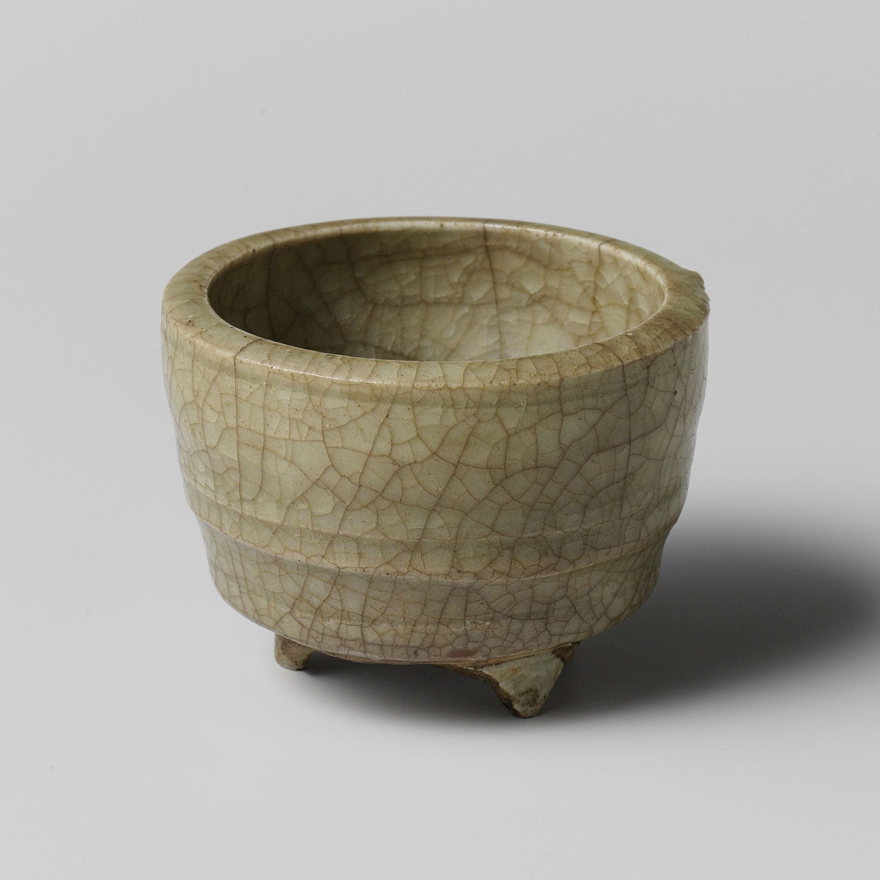 Wierookbrander van steengoed op drie korte poten en met een geribde wand, bedekt met een lichtgroen-grijs gecraqueleerd glazuur. Celadon. (Nederlands)