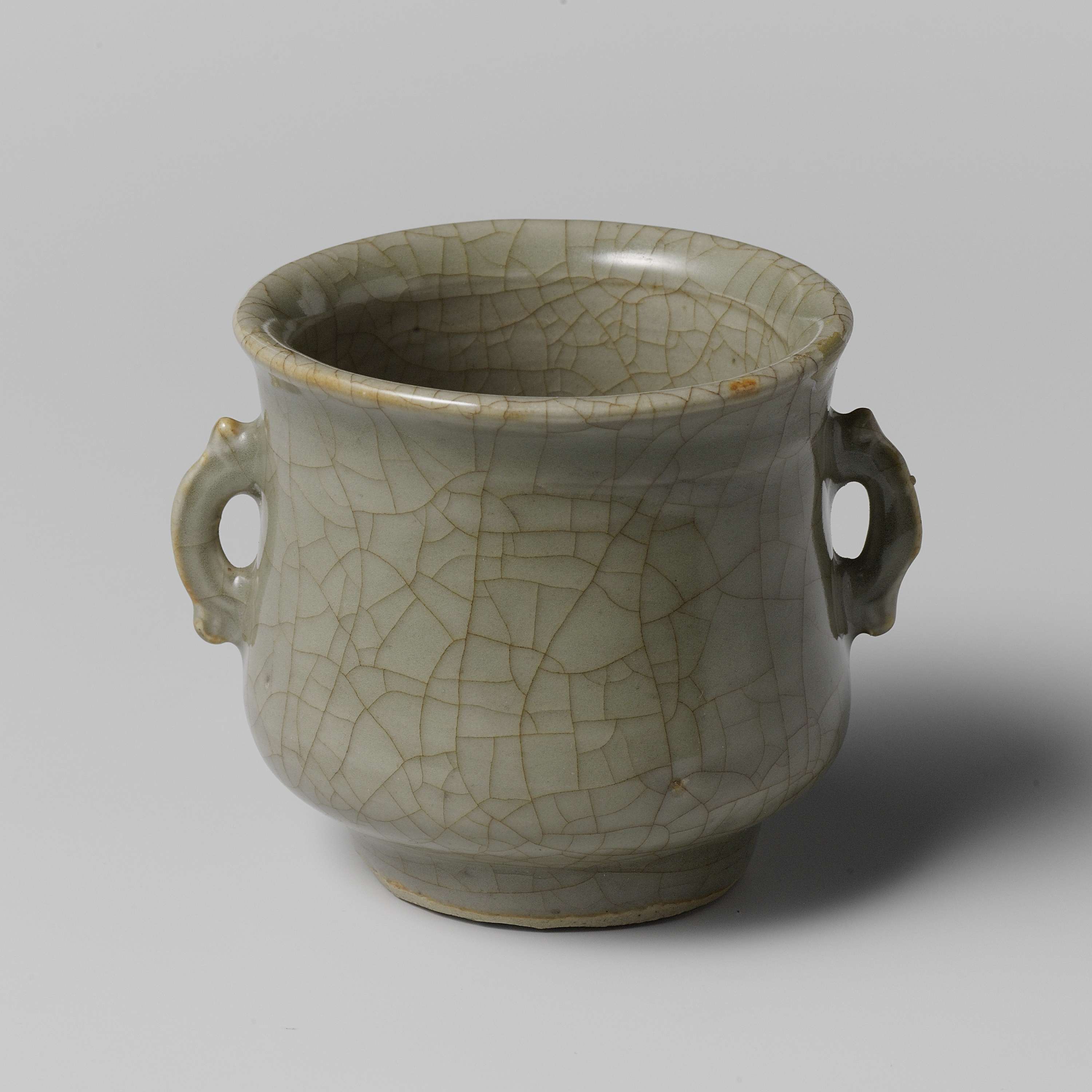 Wierookbrander van steengoed in de vorm van een archaisch bronzen vat (kuei), bedekt met een grijs-groen gecraqueleerd glazuur. Het vat heeft een wijde peervorm en twee oren. Celadon (Longquan). (Nederlands)