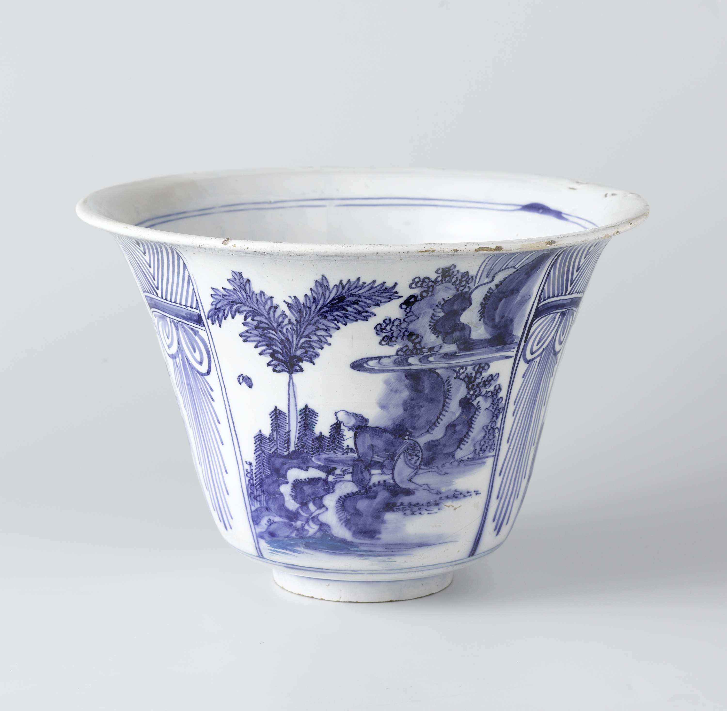 kom van blauw beschilderde faience. De kom is omgekeerd klokvormig en heeft een standring. Op de kom zijn drie vakken geschilderd waartussen een streepdecor. In een vak is een man (Chinees) geschilderd op handen en knieen liggend, in een vak is een man (Chinees) geschilderd met een vlag in zijn handen en in het andere vak is een man (Chinees) geschilderd met een langwerpig voorwerp in zijn handen. De kom is in de binnenkant op de bodem gedateerd (1581). (Nederlands)