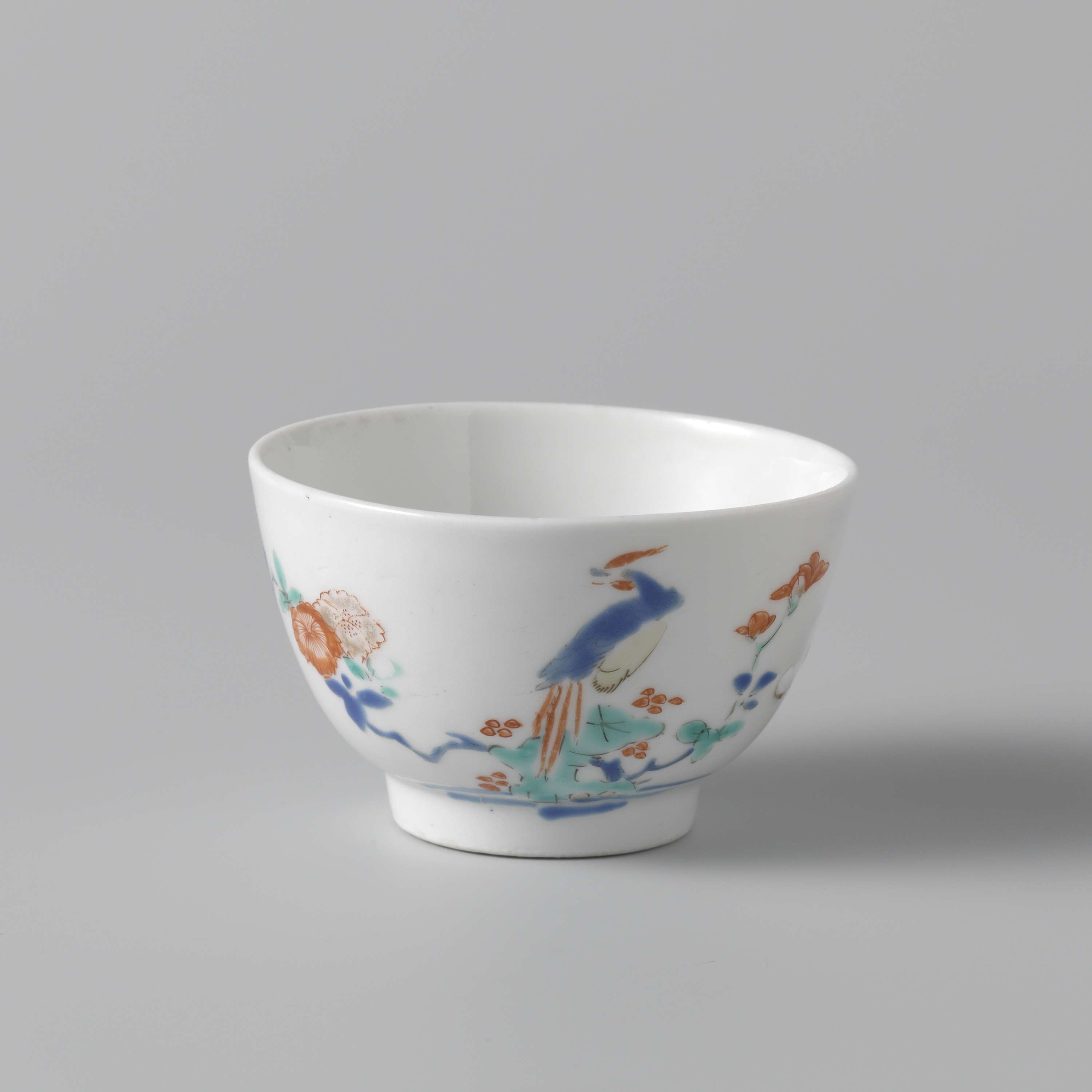 Ronde kop van porselein, beschilderd op het glazuur in blauw, rood, groen, geel, zwart en goud met een een paar hoo-vogels, een in de lucht en een op een rots met een bloemtak. Binnen op de bodem een rozet binnen een dubbele cirkel in rood en goud. 'Collectie Westendorp/ 38'. Kakiemon-stijl. (Nederlands)