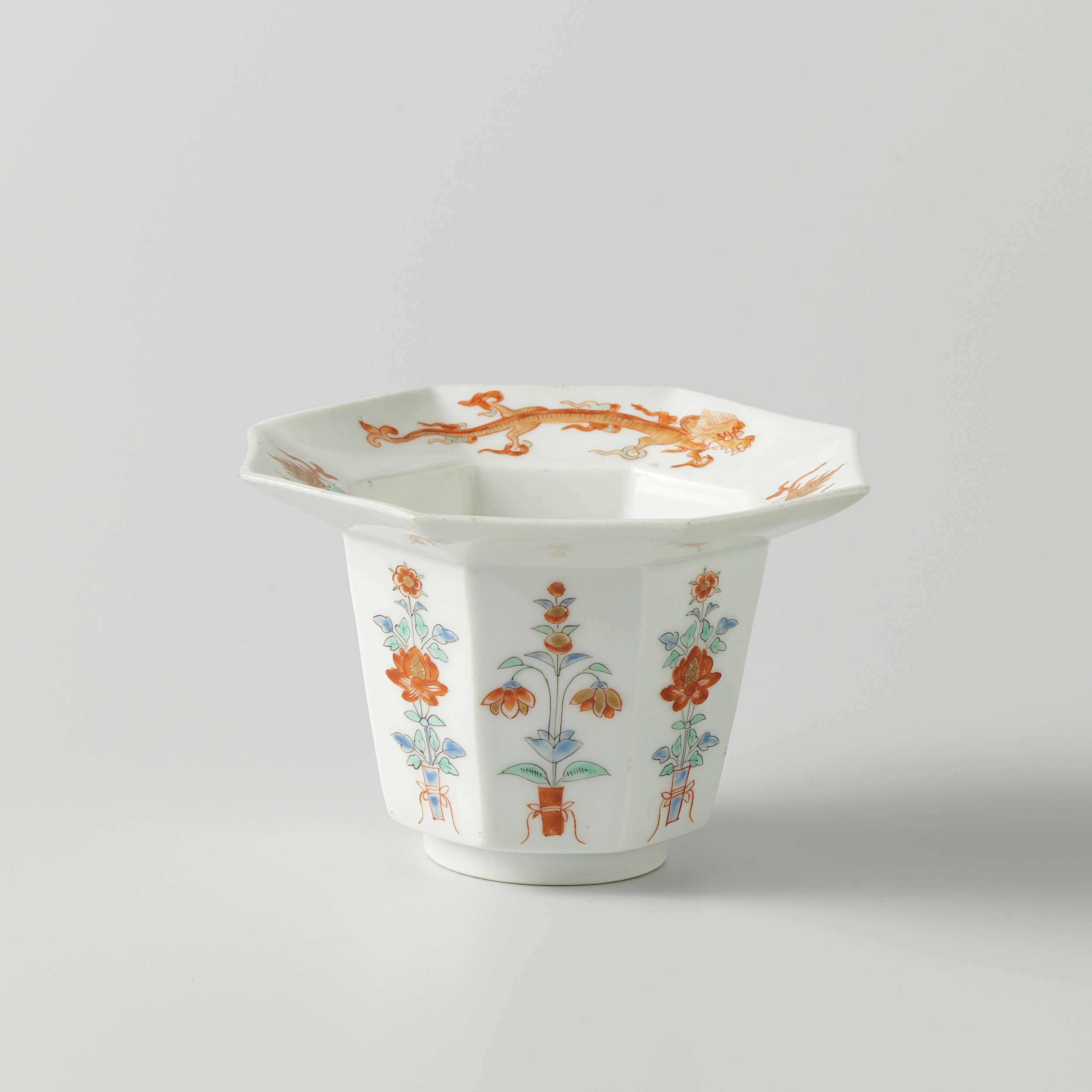 Achthoekige kom met een vlakke rand, beschilderd op het glazuur in blauw, rood, groen, geel, zwart en goud met bloemtakken op de acht buitenzijden en met twee draken die op een parel jagen op de rand. Kakiemon-stijl. (Nederlands)