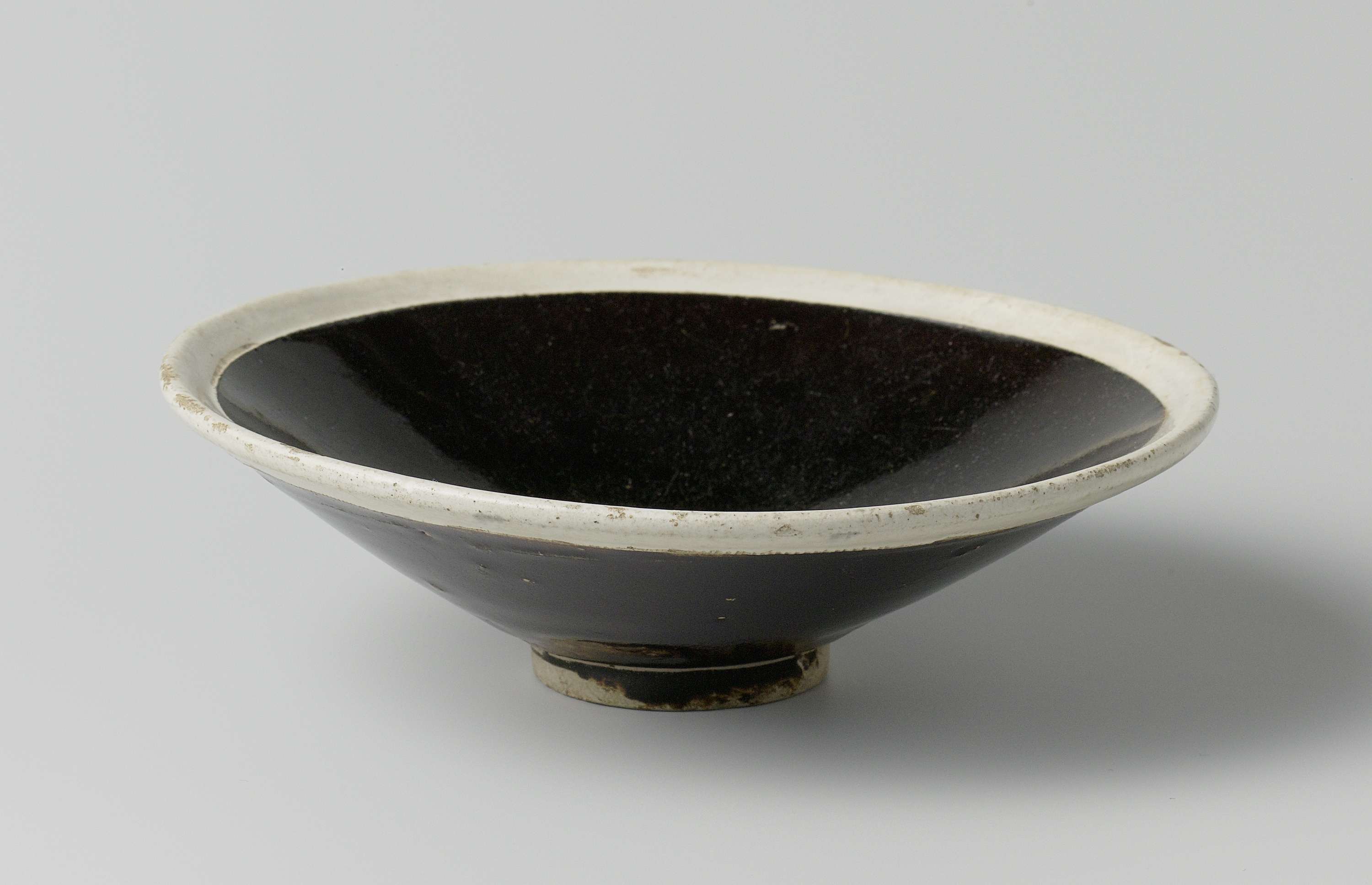 Ondiepe kom van steengoed, bedekt met een donkerbruin glazuur. De onderzijde is ongeglazuurd. De kom heeft een witte rand. Jian. (Nederlands)
