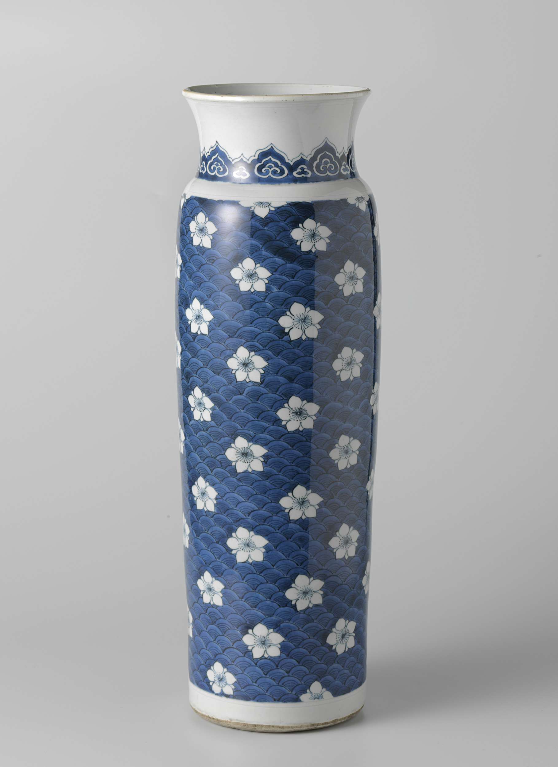 Lange rolwagen met een ongeglazuurde bodem en wijde, spreidende hals. Gedecoreerd in onderglazuur blauw met uitgestrooide prunusbloesems, die symmetrisch over de vaas zijn verspreid en zijn geplaatst op een donkerblauw decor van golven. Rondom de hals een band met 'ruyi'-motieven. (Nederlands)