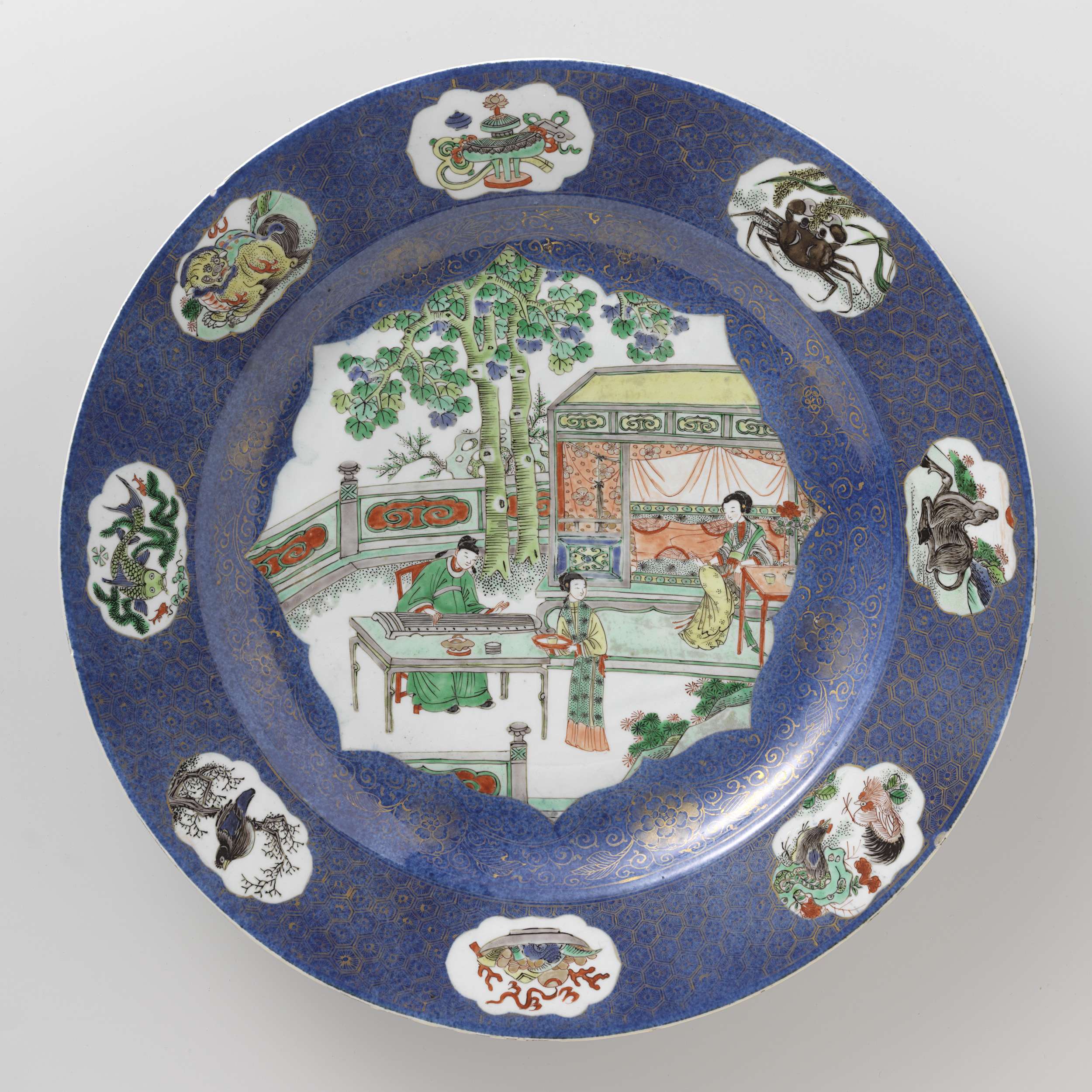 Schotel van porselein met opstaande wand en schuine rand, gedecoreerd in onderglazuur blauw en op het glazuur blauw, rood, groen, geel, aubergine, zwart en goud. De voorzijde van de schotel is bedekt met bleu poudré (poederblauw) met hierin uitgespaard op het plat een groot geschulpt veld gevuld met drie personen op een omheind terras met rotsen en twee bomen, een geleerde aan een tafel spelend op een qin, een vrouw zittend aan een tafel voor een bed, een dienstmeisje met een kom op een dienblad; de wand met een gouddecoratie op het blauw met bloemrozetten en ranken; de rand met een gouddecoratie op het blauw met een geometrisch patroon, hierin uitgespaard acht vakken met antiquiteiten (wierrookbrander, ruyi-scepter), kostbaarheden (parel, ruit, muzieksteen, hoorns), boeddhistische gelukssymbolen (schelp) en (mythologische) dieren in een landschap (krab, hert, hanen, vis, vogel en shishi/leeuwhond). Gemerkt op de onderzijde met twee vissen in een dubbele cirkel. Bleu poudré met famille verte. (Nederlands)