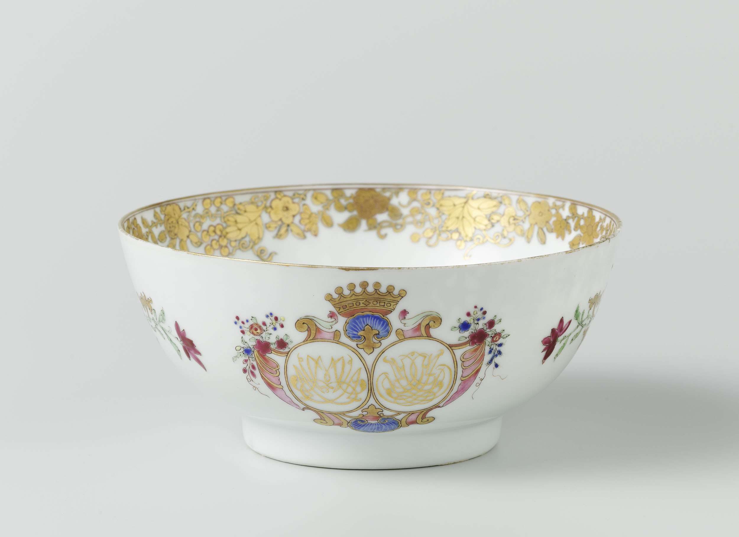 Kom van porselein, beschilderd op het glazuur in blauw, rood, roze, groen, geel, zwart en goud. Op de buitenwand tweemaal een gekroond, dubbel spiegelmonogram met 'MVA' en 'CHTD' omgeven door schelpmotieven, krulwerk en bloemtakken, tussen de monogrammen een lotusrank; de binnenrand met een band met bloemranken; op de bodem een bloemrozet. Een barst in de rand. Europese voorstelling in emailkleuren. (Nederlands)