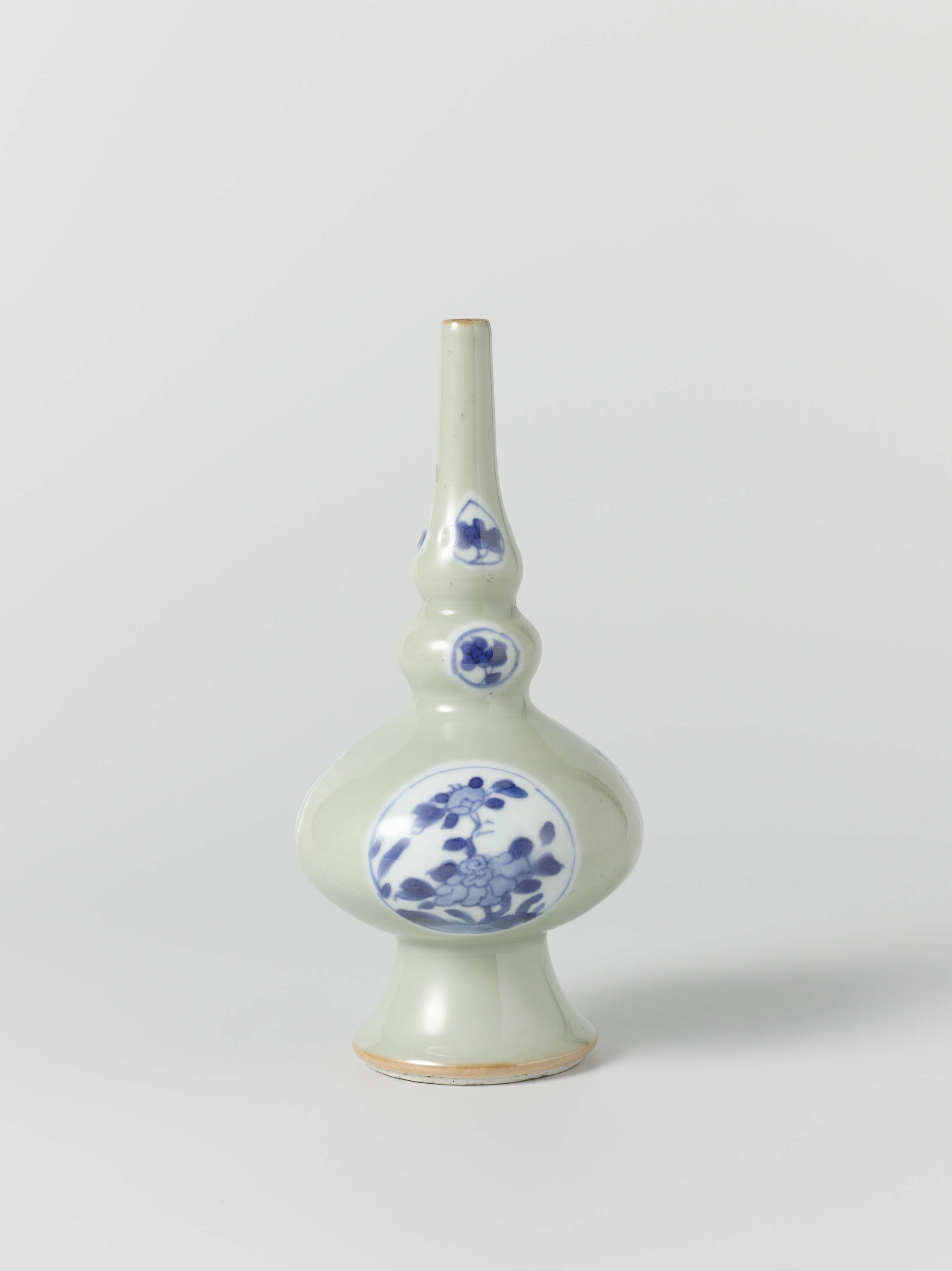 Rozenwater druppelaar of puntfles op hoge voet van porselein met bolvormig lichaam en twee verdikkingen in de lange, smalle nek, bedekt met een celadongroen glazuur en beschilderd in onderglazuur blauw. De fles is bedekt met een celadon groen glazuur met hierin negen reserves gevuld met bloemtakken in onderglazuur blauw. Monochroom celadon groen met onderglazuur blauw. (Nederlands)