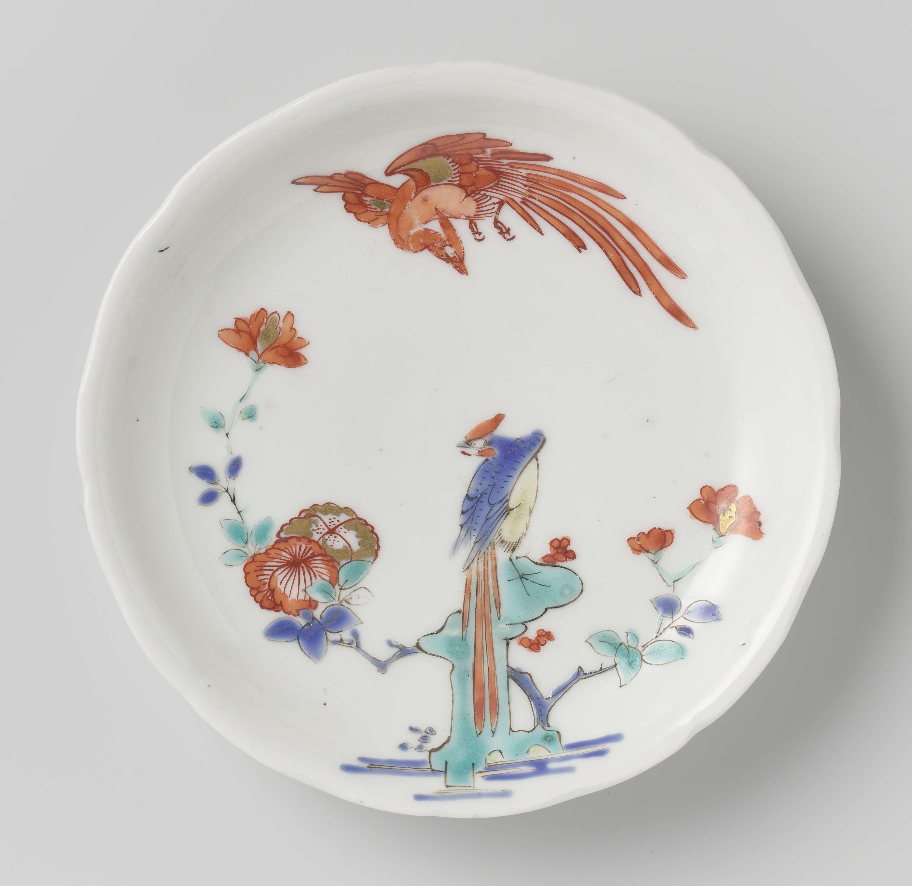 Geschulpte schotel van porselein, beschilderd op het glazuur in blauw, rood, groen, geel, zwart en goud met een een paar hoo-vogels, een in de lucht en een op een rots met een bloemtak. Kakiemon-stijl. (Nederlands)