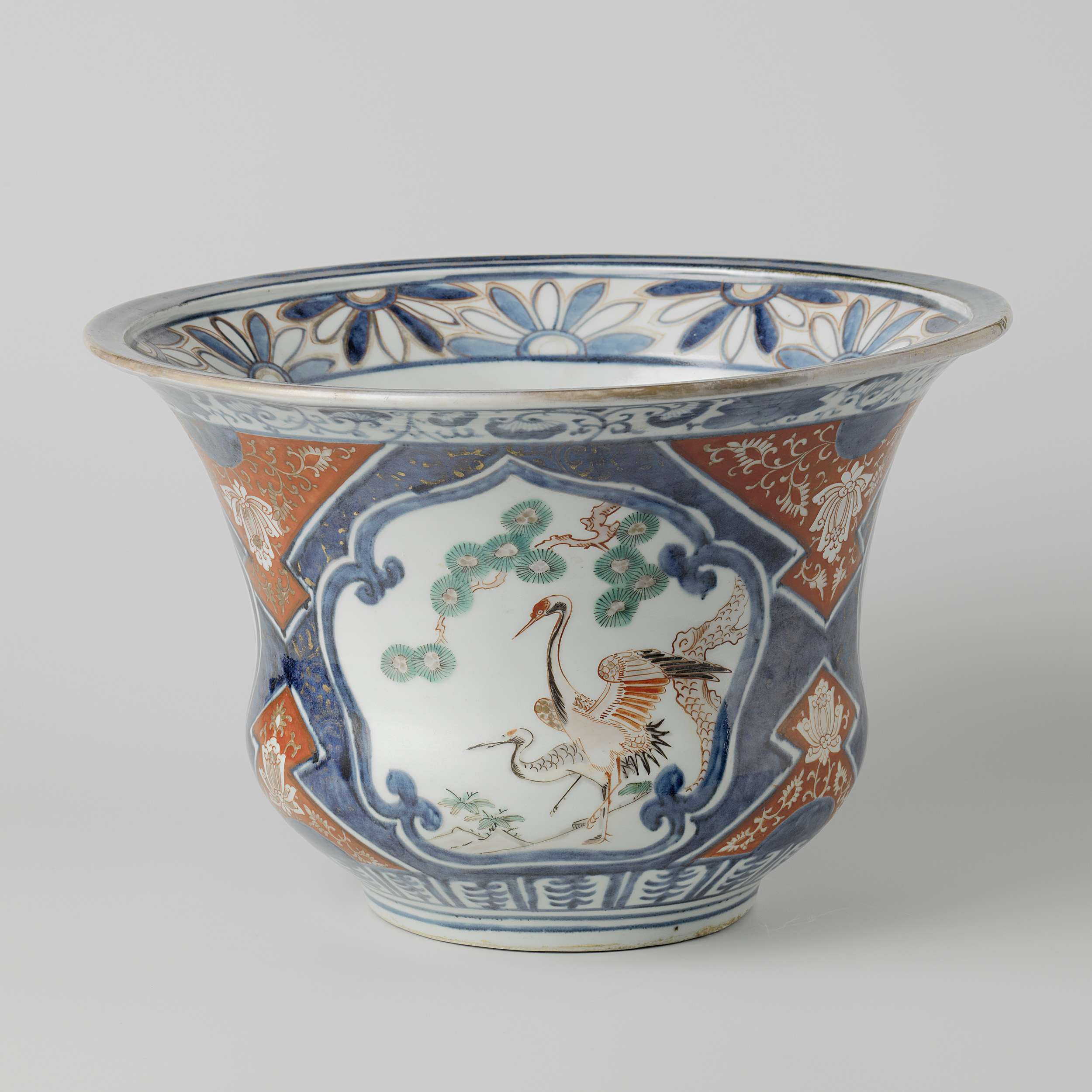 Bloempot van porselein, beschilderd in onderglazuur blauw en op het glazuur rood, groen, zwart en goud. Op de buitenwand drie geschulpte cartouches met twee kraanvogels bij een pijnboom, een hoo-vogel boven een boom en één met een shishi (leeuwhond) bij een pioen. Om de cartouches bladranken onderbroken door twee tegenover elkaar liggende vakken vanuit de rand en de voet met lotusranken en een halve bloemrozet. Rond de voet een band met bloembladvormige vakken met bloemtak; op de buitenrand een band met lotusranken. De binnenrand met een band met halve bloemrozetten. In de bodem een gat, dichtgestopt met een kurk. Imari. (Nederlands)