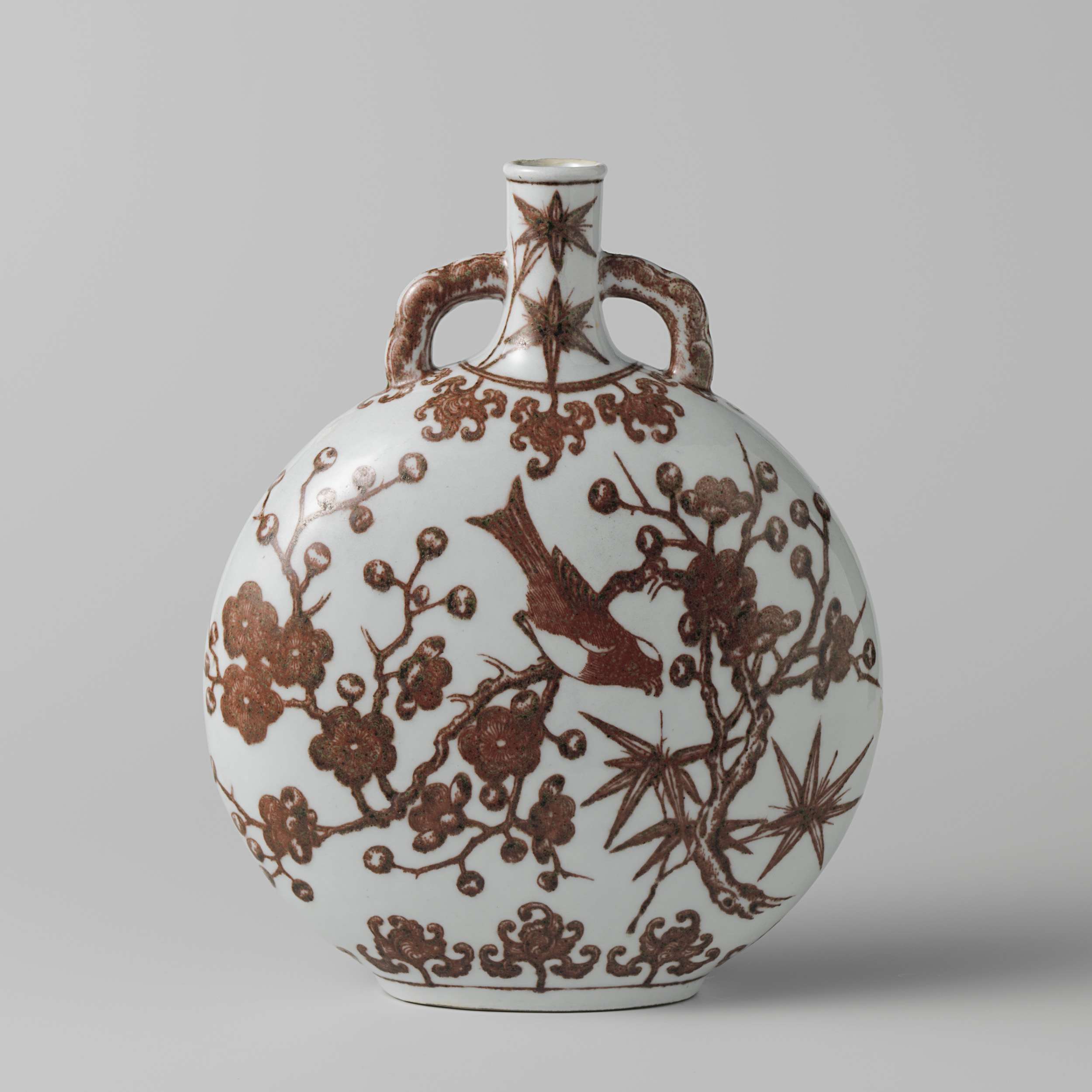 Platte, ronde fles van porselein met twee kleine oren tussen de schouder en hals, beschilderd in onderglazuur rood. Op de wand prunustakken en bamboe met twee vogels; om de voet en de schouder een gestileerd wolkmotief; de hals met bamboebladeren; de oren met decoratief motief. Gemerkt op de onderzijde met het zegelmerk van keizer Qianlong. Rand beschadigd. Op de onderzijde een label van Bluett & Sons London. Onderglazuur koperrood. (Nederlands)