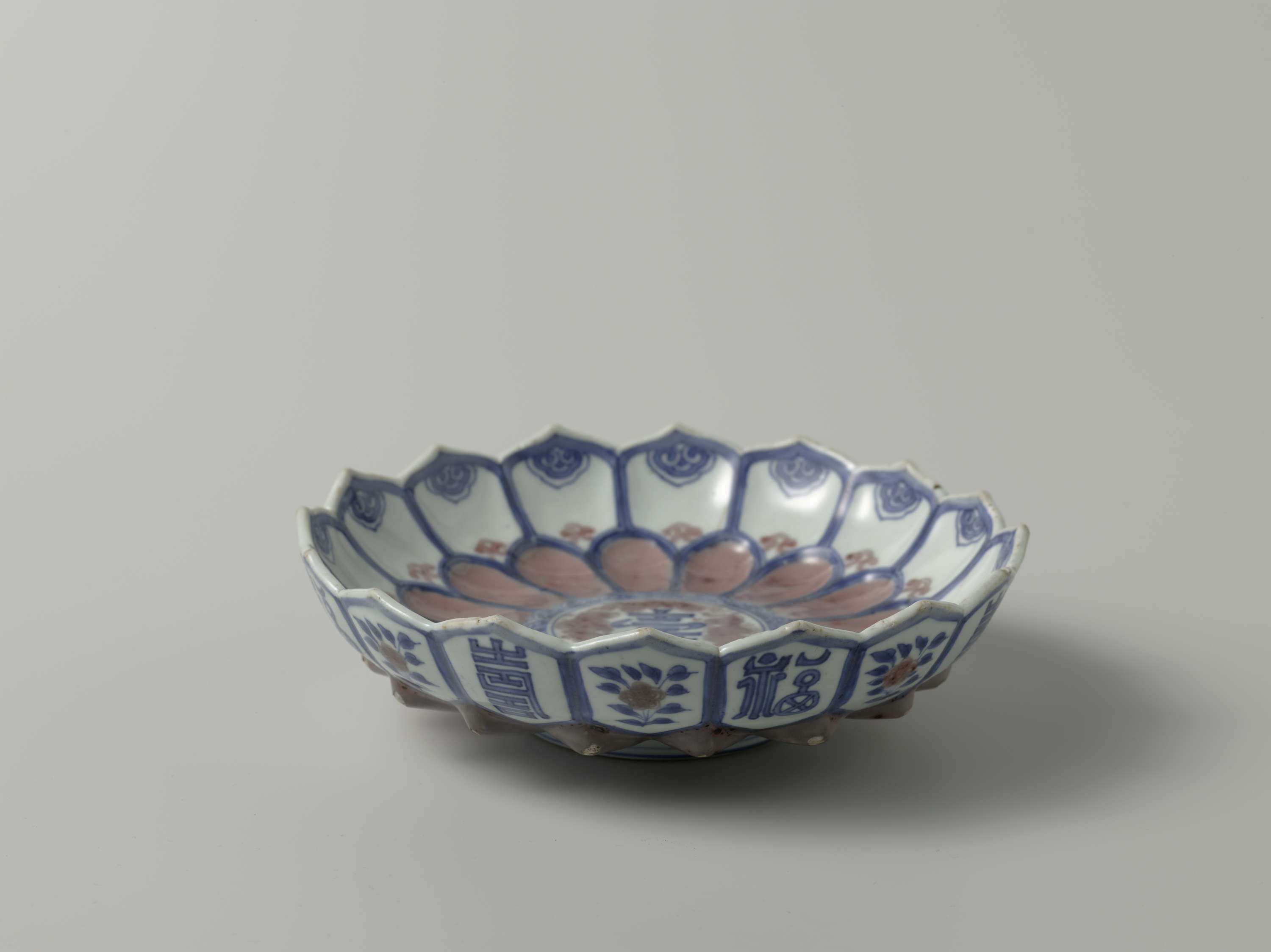 Schaal van porselein gemodelleerd in de vorm van een lotus, beschilderd in onderglazuur blauw en rood. Op het plat een medaillon met het 'shou' karakter omgeven door een band met ruyi-motief; hier omheen een rand gemodelleerde bloembladeren overlopend in een tweede rand puntige bloembladeren met ruyi-motief; de bovenste rand bladeren heeft aan de buitenzijde afwisselend bloemtakken of het 'shou' of 'fu' karakter, beide staan voor geluk. Op de onderzijde een acht-karakter Hall mark 'Kangxi renzi Zhonghetang zhi'. Meerdere chips in de rand; de punten van de onderste rij bloembladeren aan de buitenzijde beschadigd. Onderglazuur blauw met koperrood. (Nederlands)