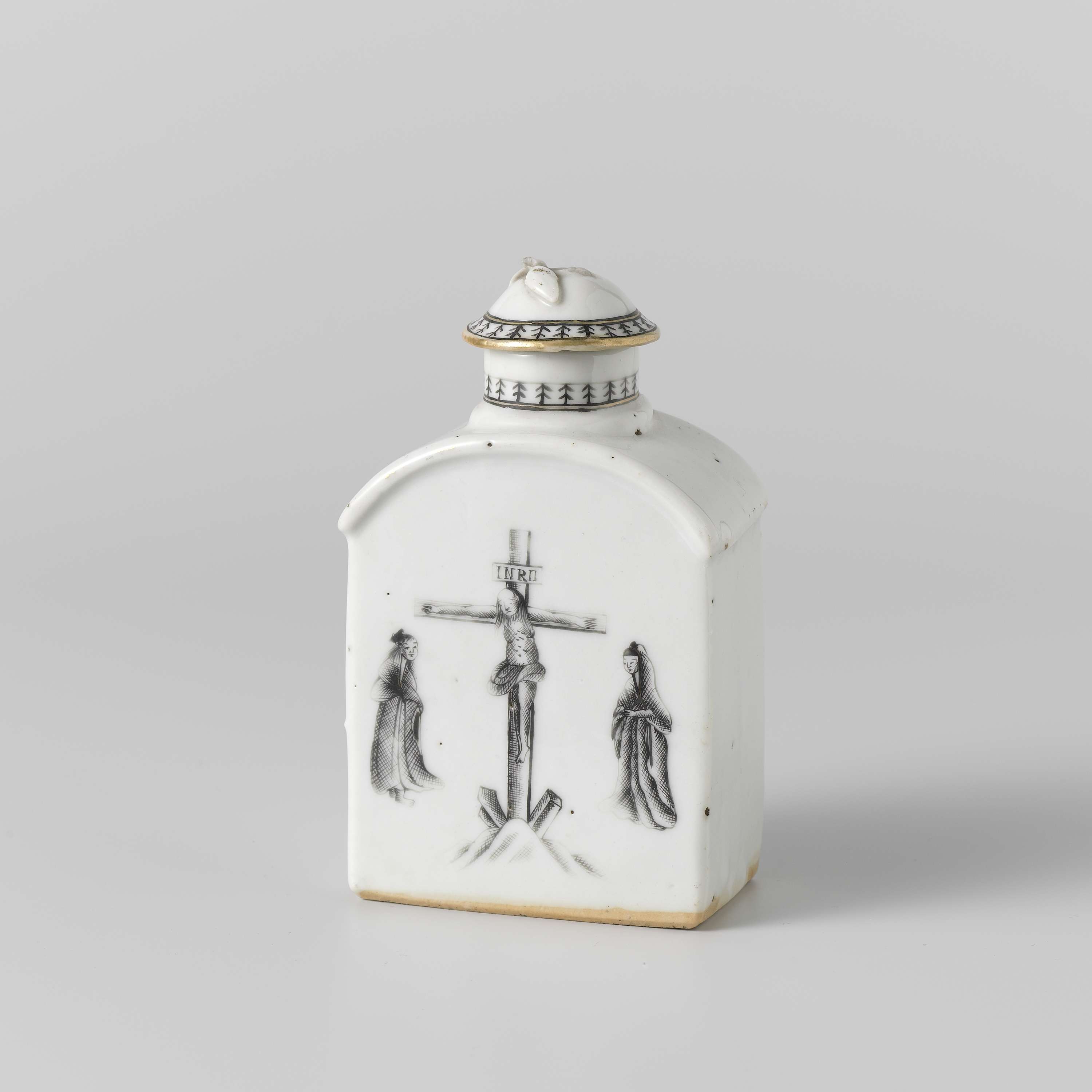 Rechthoekige theebus van porselein met iets verdikte, ronde schouder en deksel, beschilderd op het glazuur in zwart en goud. Op de buitenzijde tweemaal een voorstelling van de Kruisiging met de twee Maria's; de nek en de dekselrand met een band met een decoratief patroon. Dekselknop in de vorm van een perzik. Onderzijde ongeglazuurd. Een chip in de rand van de deksel; dekselknop gebroken. Onderdeel van een theeservies. Europese voorstelling in encre de Chine. (Nederlands)