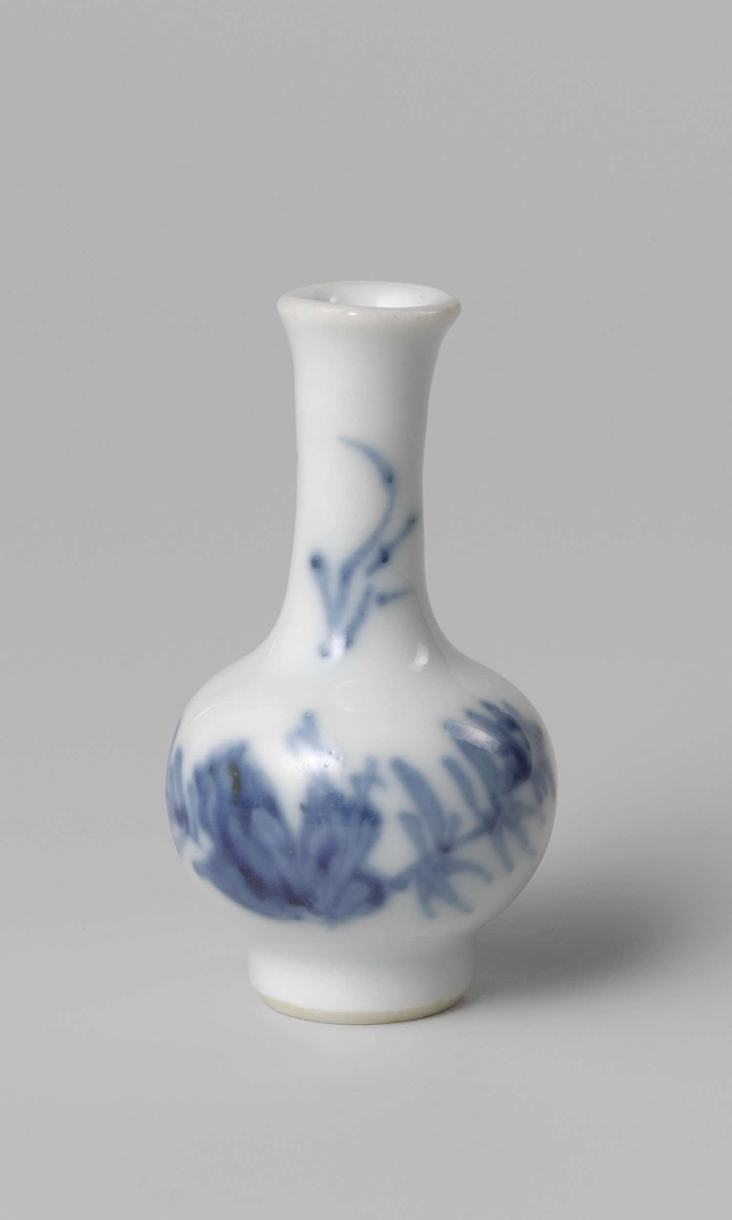 Miniatuur flesvormige vaas van porselein, beschilderd in onderglazuur blauw. Op de wand een bloeiende plant. De nek met twijgjes. Blauw-wit. (Nederlands)