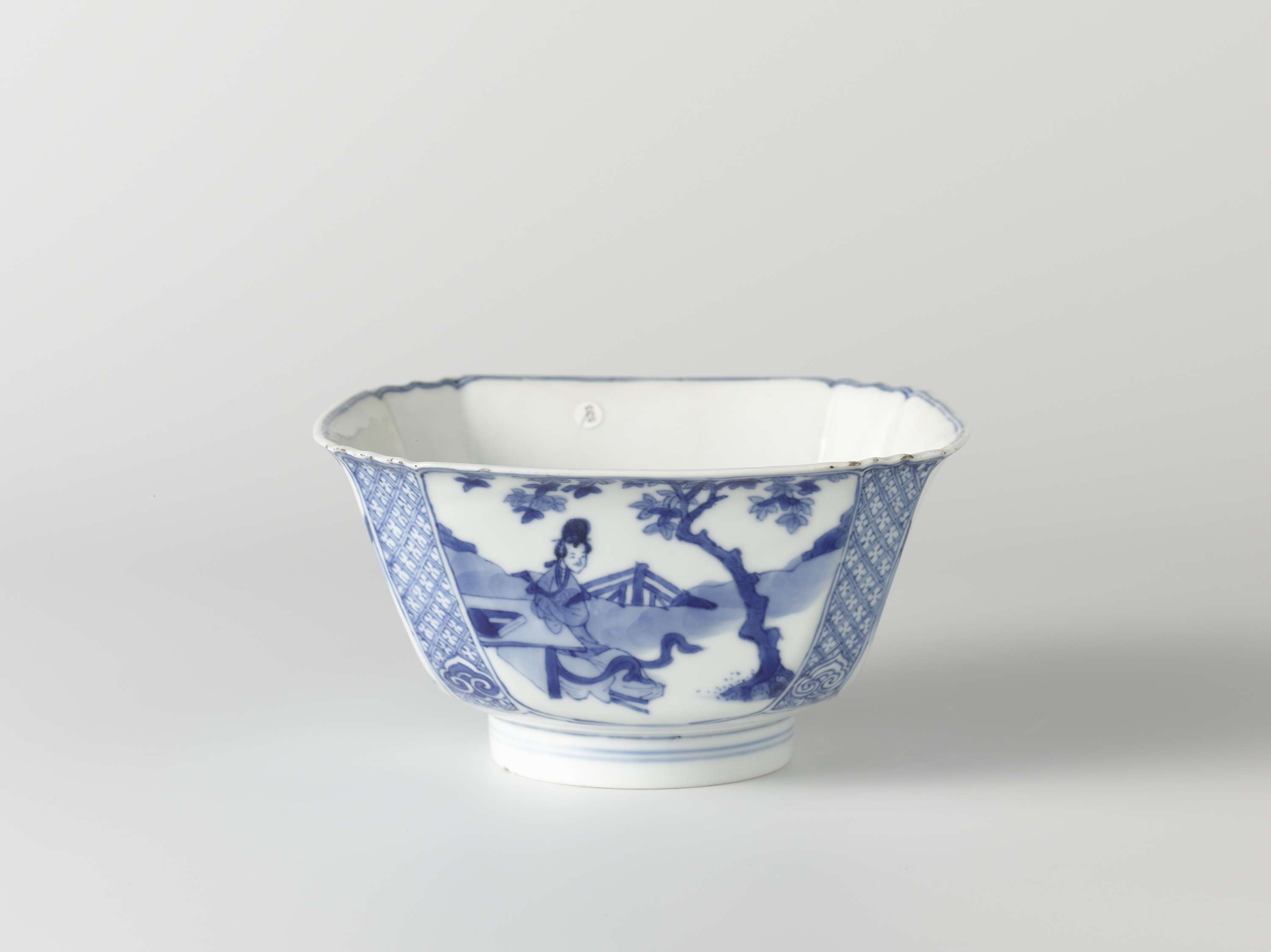 Vierkante kom van porselein met afgeplatte hoeken en gerschulpte rand, beschilderd in onderglazuur blauw. Op de wanden telkens een vrouw (lange lijs) in een landschap bij een boom (bananenplant, pijnboom, wilg, paulownia). Op de hoeken servetwerk met een ruyi-motief. Op de bodem een vierkant cartouche met ingeknepen hoeken met drie dansende jongens (zotjes) in een landschap. Gemerkt op de onderzijde met het zes-karaktermerk van keizer Chenghua in een dubbele cirkel. Blauw-wit. (Nederlands)