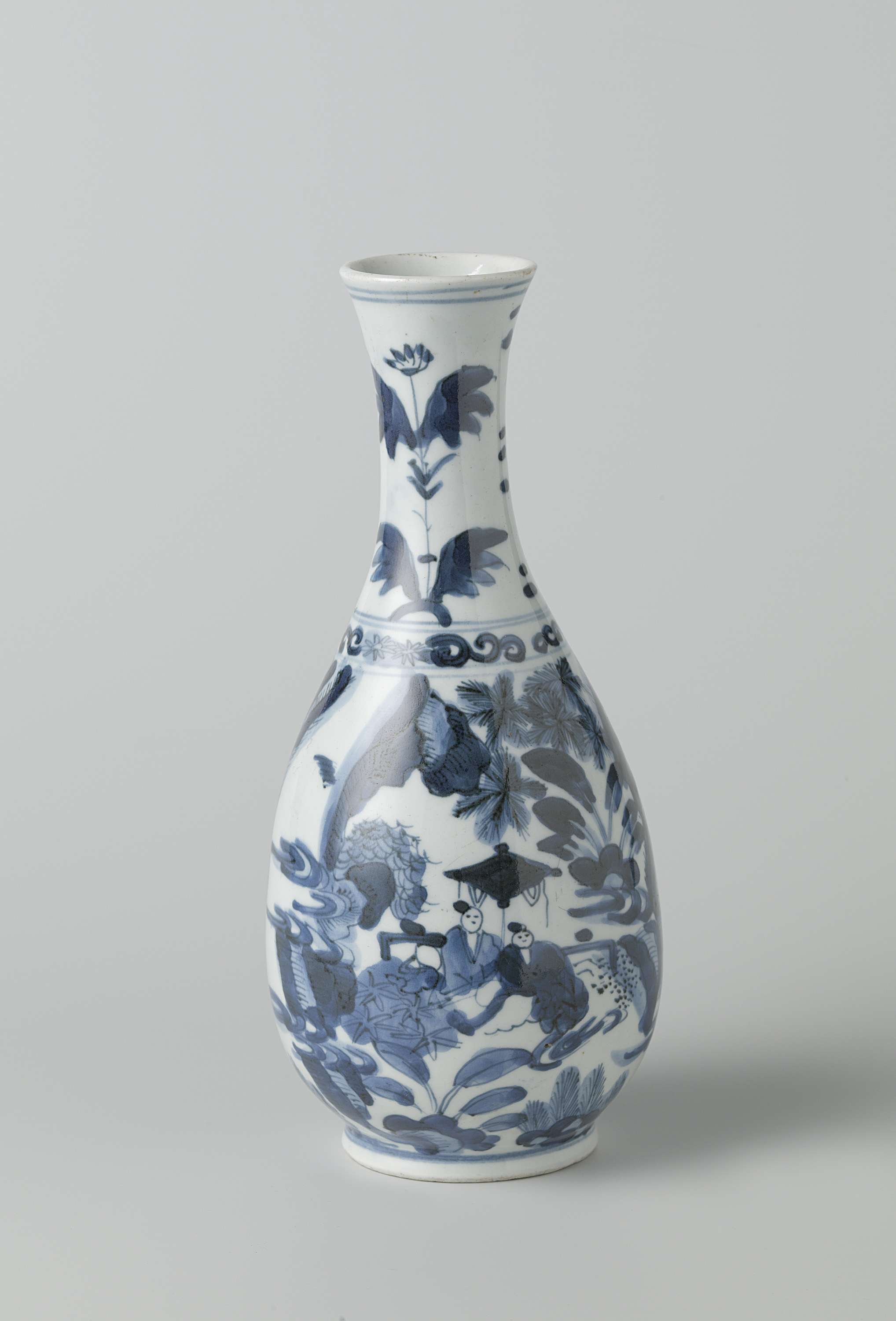 Fles van porselein met peervormig lichaam en spreidende hals, beschilderd in onderglazuur blauw. Op de buik een doorlopende voorstelling met mensen in een landschap. Op de schouder een band met bloemranken. De nek met drie keer een tulpmotief. Arita, blauw-wit. (Nederlands)