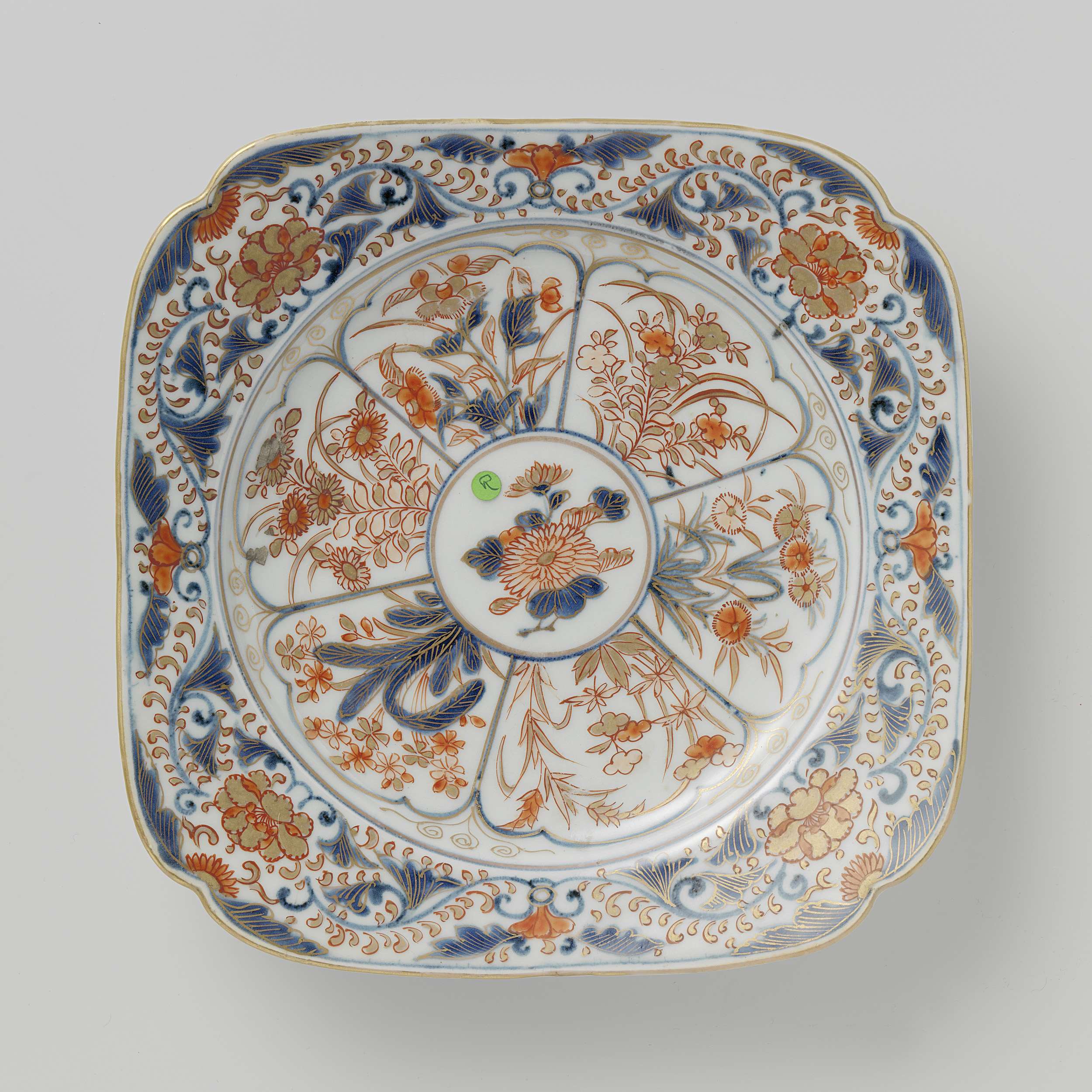 Vierkante schotel van porselein met ingeknepen hoeken en een rond plat, beschilderd in onderglazuur blauw en op het glazuur rood en goud. Op het plat een bloemvormig cartouche met in elk vak bloeiende planten. Op de rand bloemranken. De buitenrand met vier bloemtakken (prunus, pioen). Vier proenen op de onderzijde. Imari. (Nederlands)