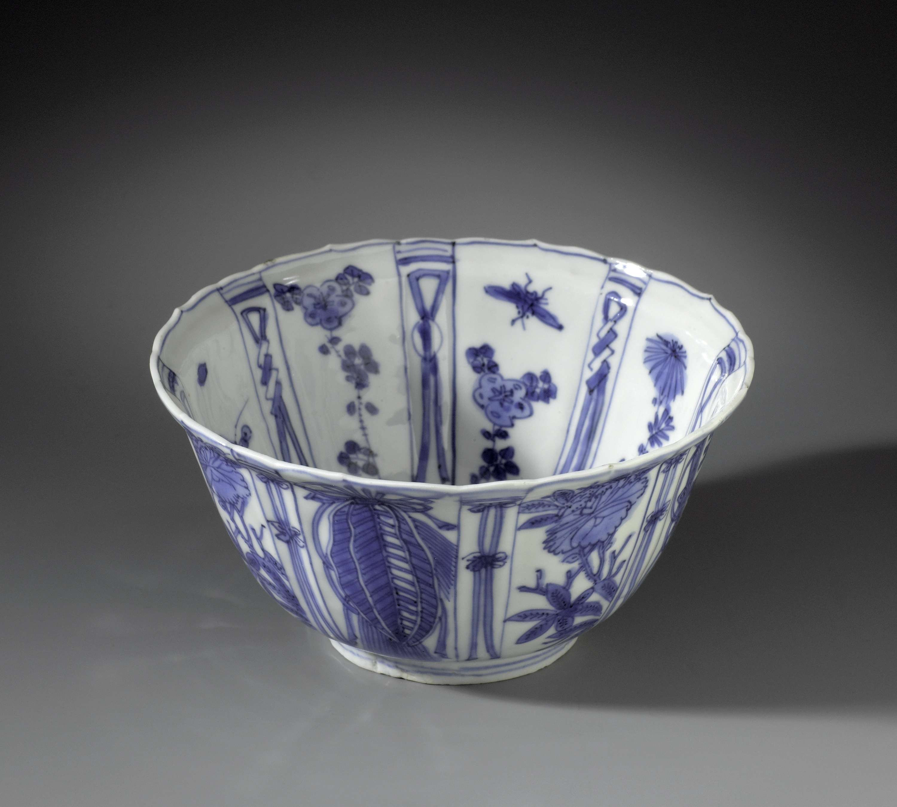 Kom of kraaikop van porselein met geschulpte rand, beschilderd in onderglazuur blauw. De buitenwand is verdeeld in brede en smalle vakken, met in de brede vakken afwisselend een bloemtak of gelukssymbolen. De smalle vakken met afhangende strikken. Op de bodem een vogel op een rots. De brede vakken op de binnenwand met bloemtakken, de smalle met afhangende strikken. Kraakporselein in blauw-wit. (Nederlands)