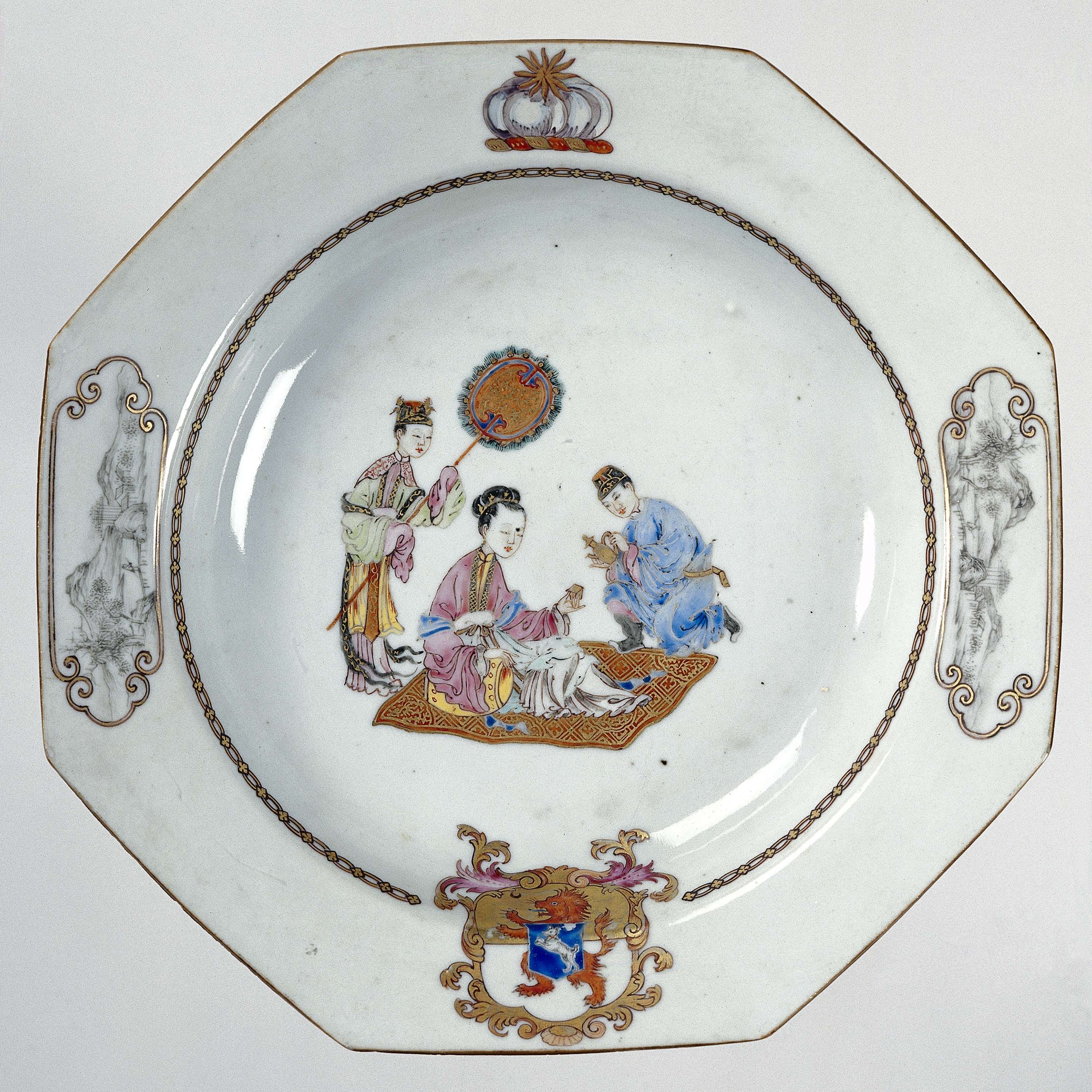 | Nederlands | Achthoekig soepbord met een zittende vrouw met twee bedienden en op de rand het wapen van de familie Powell |