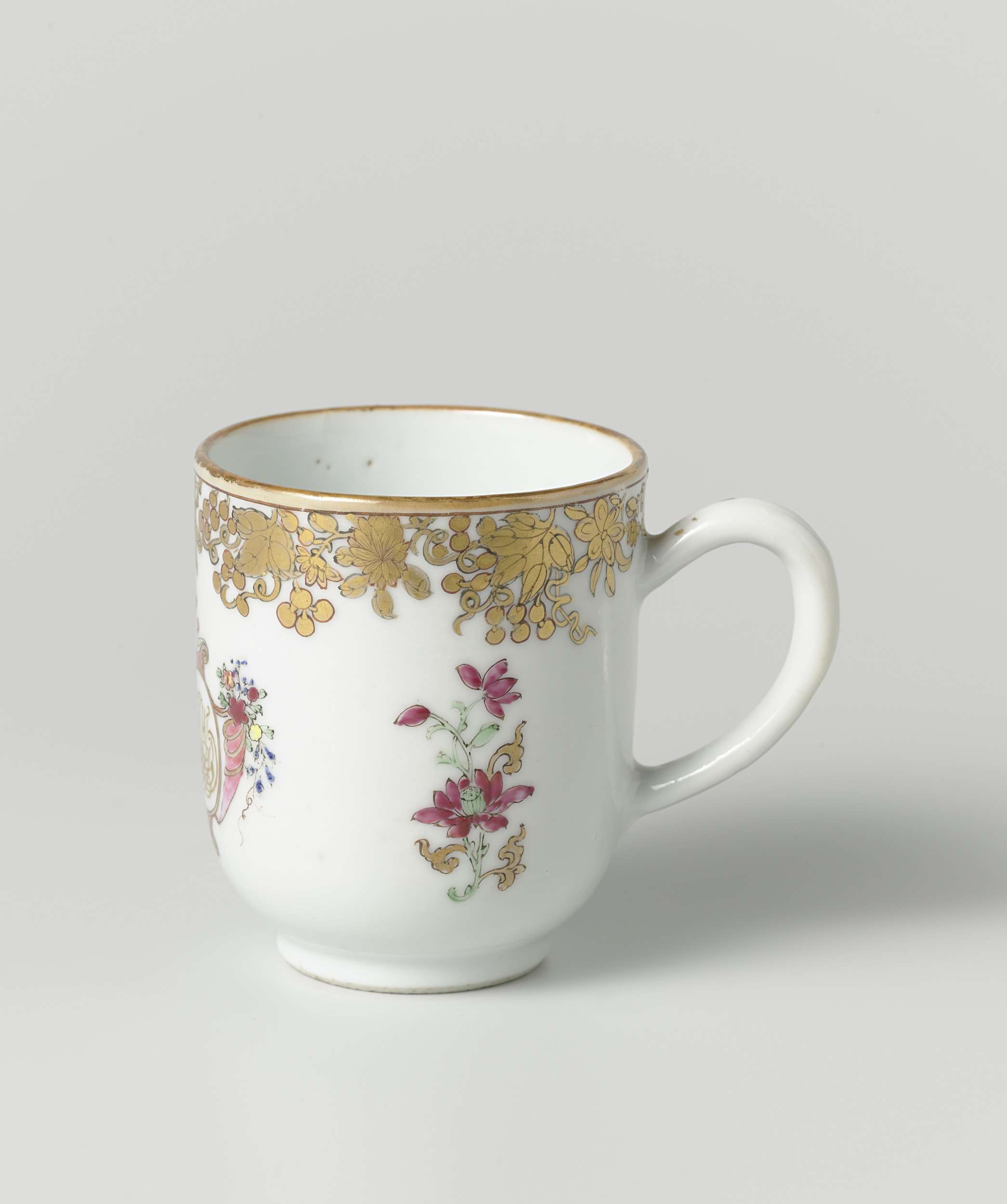 Rechte kop op een voetring, en met een C-vormig oor. De lip is bruin geglazuurd. Tegenover het oor is een dubbel spiegelmonogram geschilderd met terweerszijden een bloeiende lotusrank; langs de bovenrand een band met bloemranken in goud. (Nederlands)