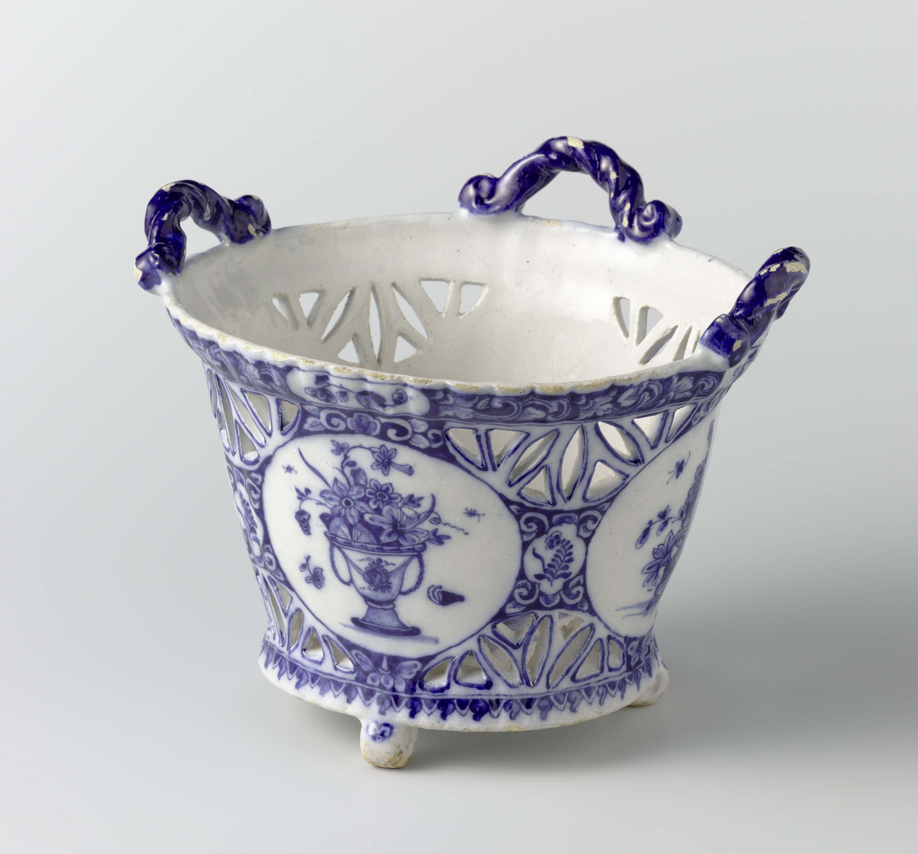 Mand van faïence, met drie oren en opengewerkte rand. In blauw beschilderd met lambrequins en Chinese voorstellingen. Op de bodem zijn toiletartikelen geschilderd. Gedateerd 1740. (Nederlands)